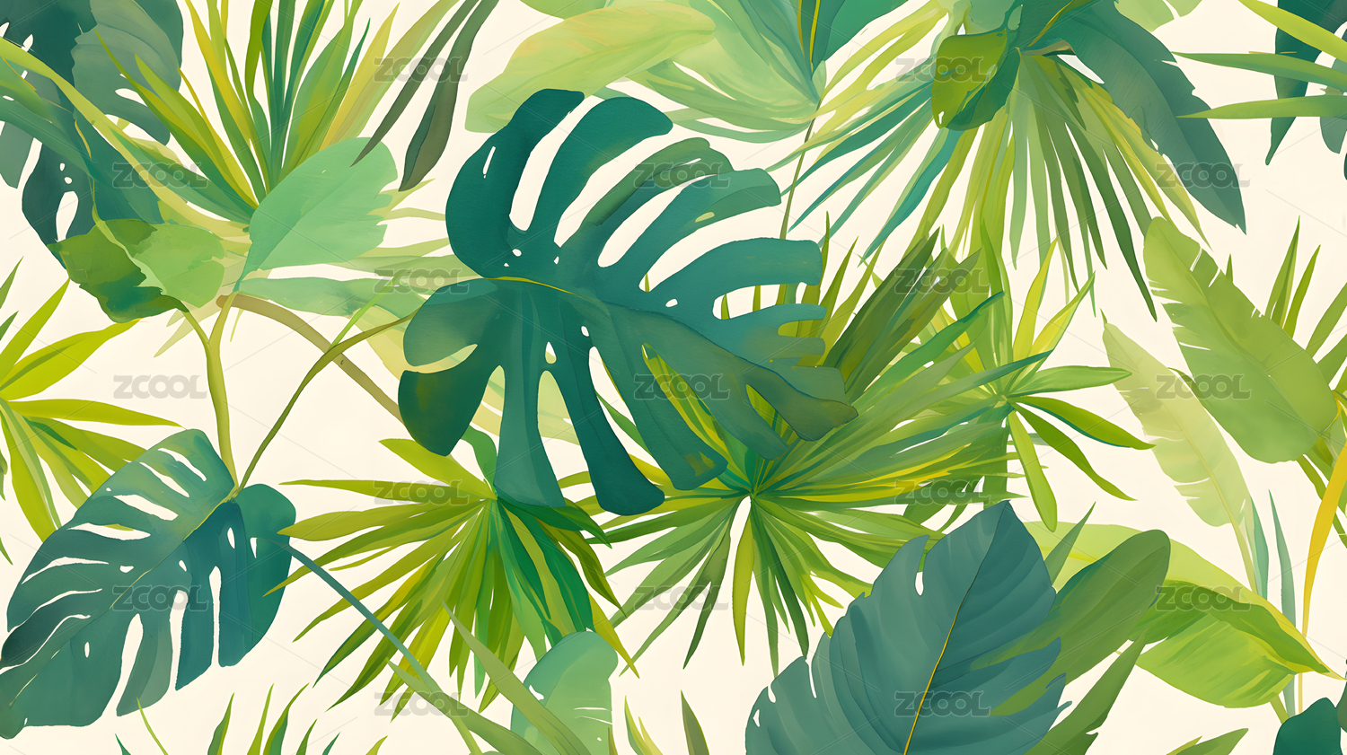 热带图案无缝纹理手绘妖怪叶子水彩效果