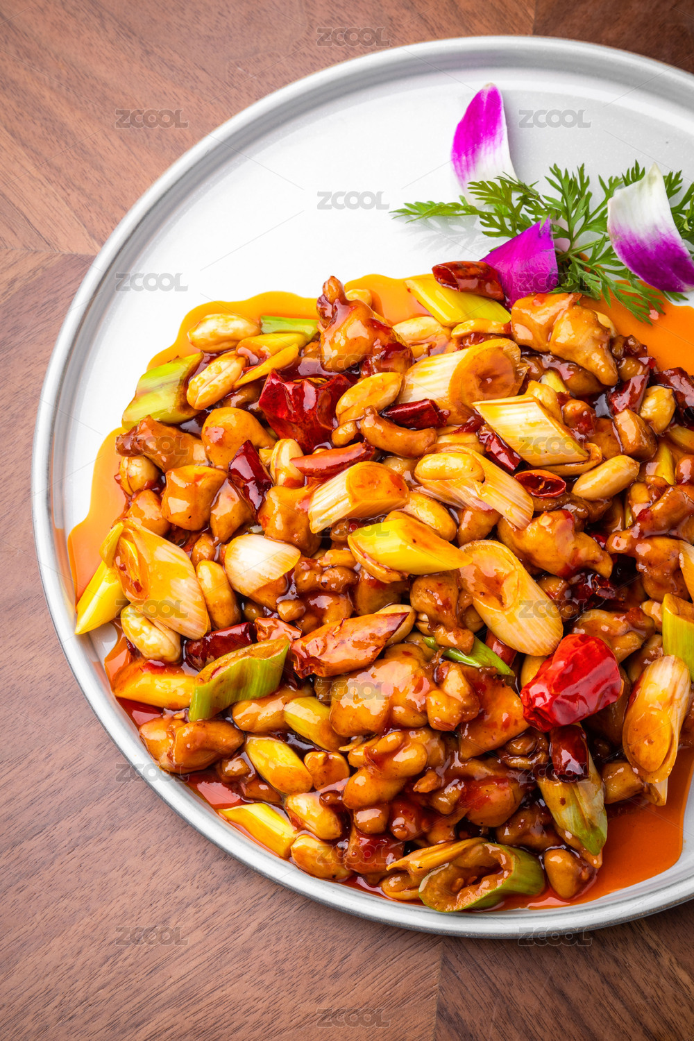 棕色木纹桌上放着一盘宫保鸡丁