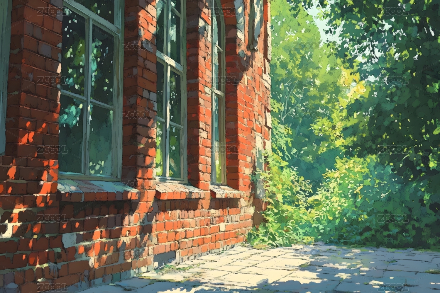 夏天白天阳光明亮的门窗外绿色原野3D插画