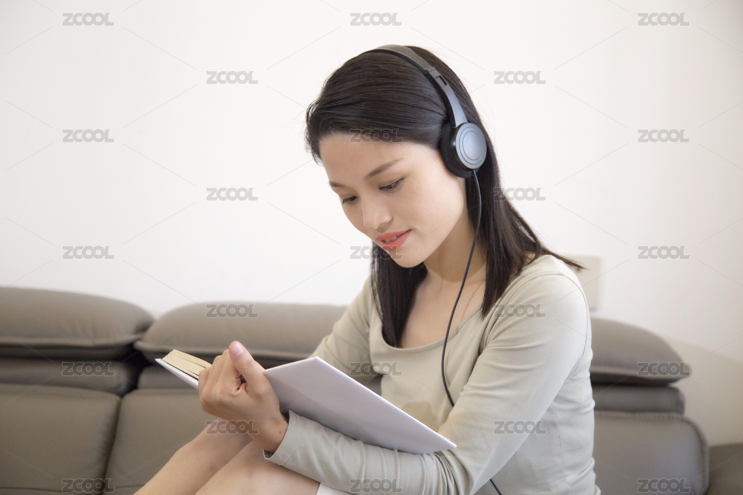 快乐悠闲的女子坐在沙发上看着窗外的景色,并使用移动平板听音乐耳机放松。