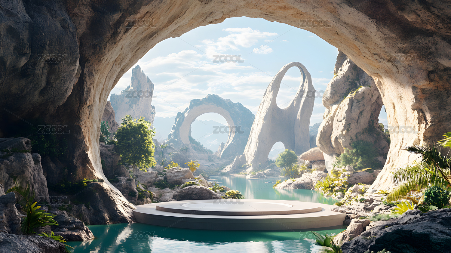 3D新中式拱门山峰风景电商产品展台