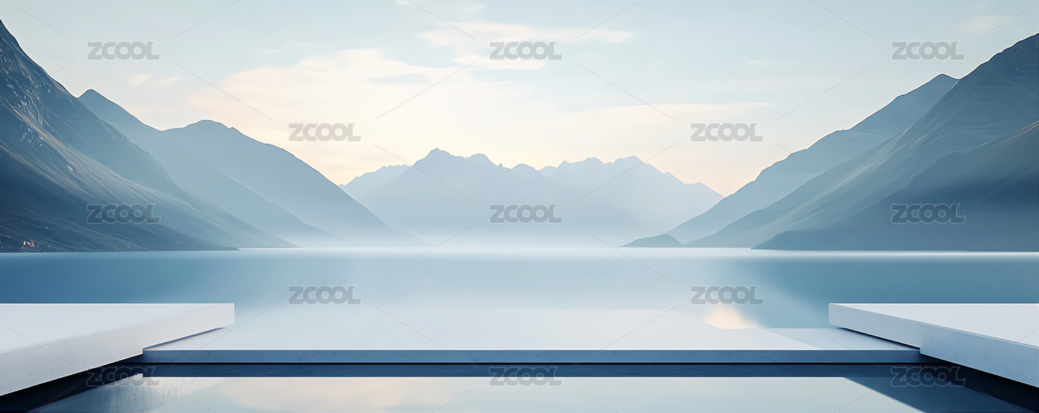 新中式,现代,光影,山,白色,蓝色,极简,雾,背景,三维