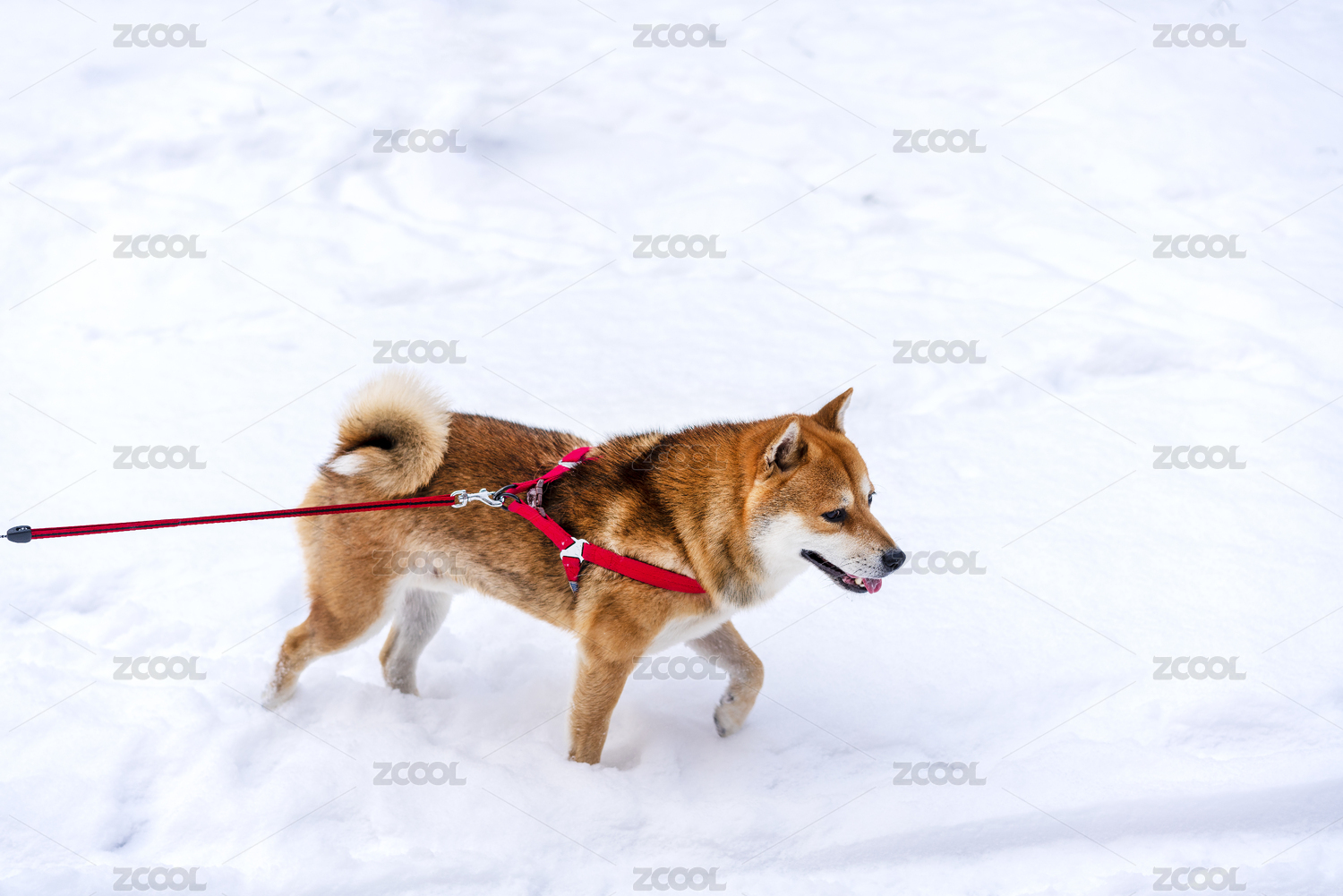 北方冬季雪地里柴犬宠物狗狗在奔跑