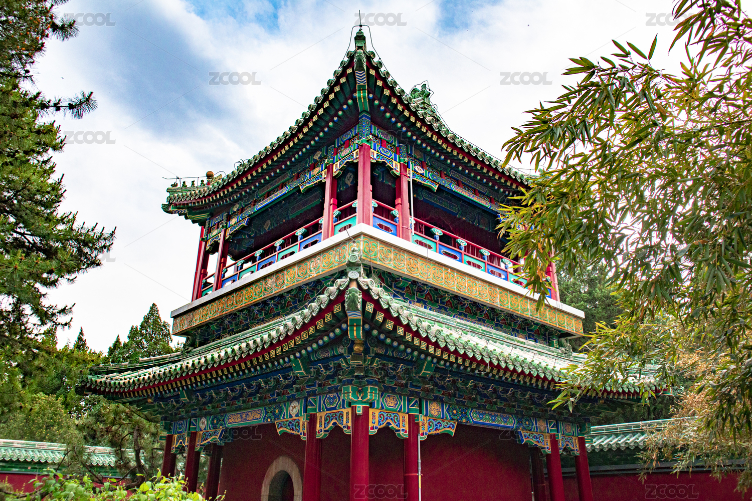 秋天蓝天下的北京颐和园公园的古亭台楼阁建筑