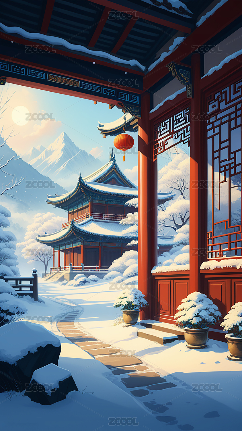 中国风冬天户外古建筑手绘插画