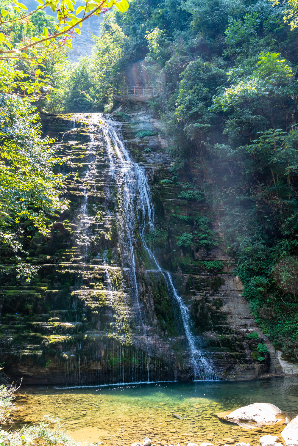 中国陕西汉中宁强大巴山中禅家岩天坑的瀑布
