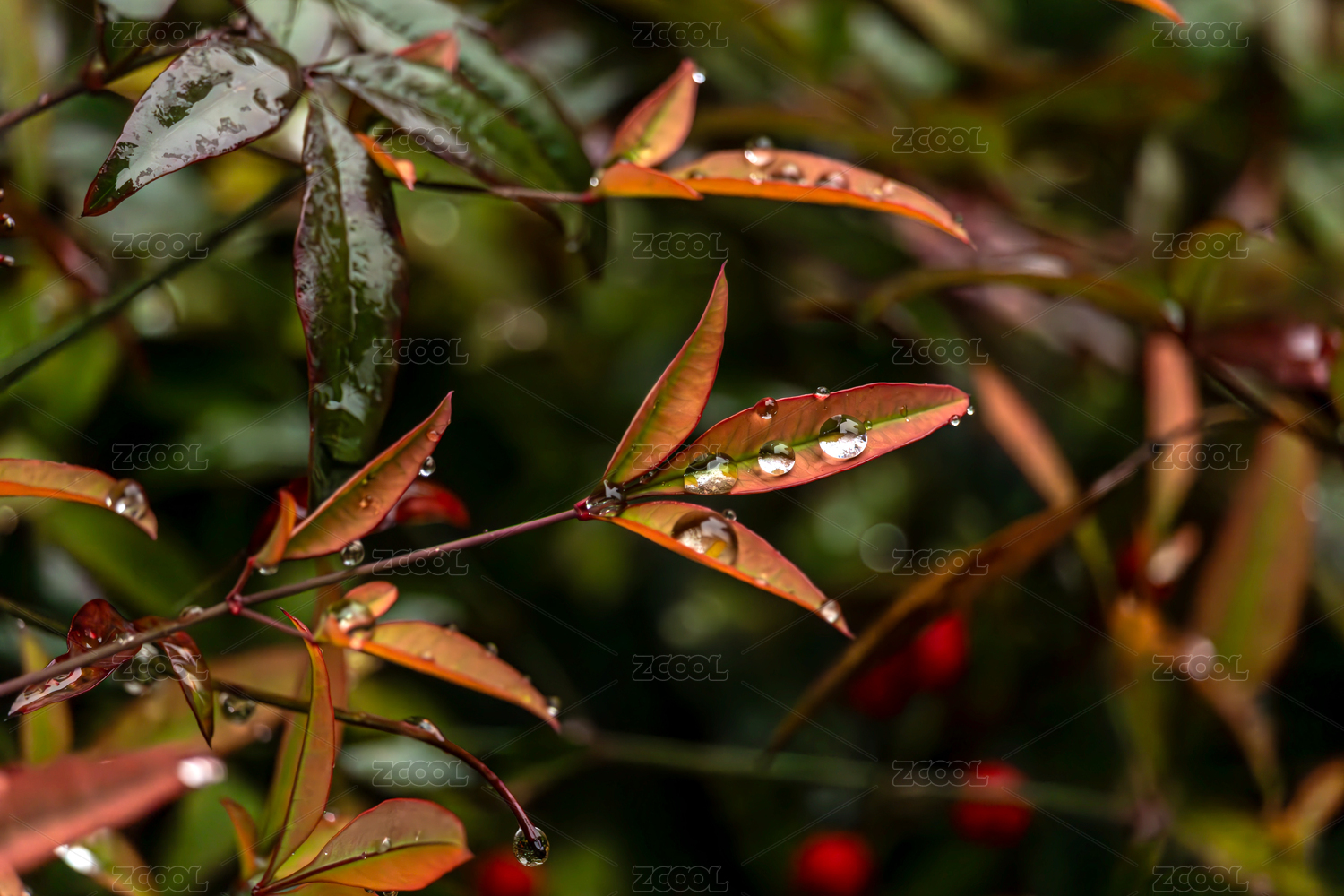 带雨滴的红叶子