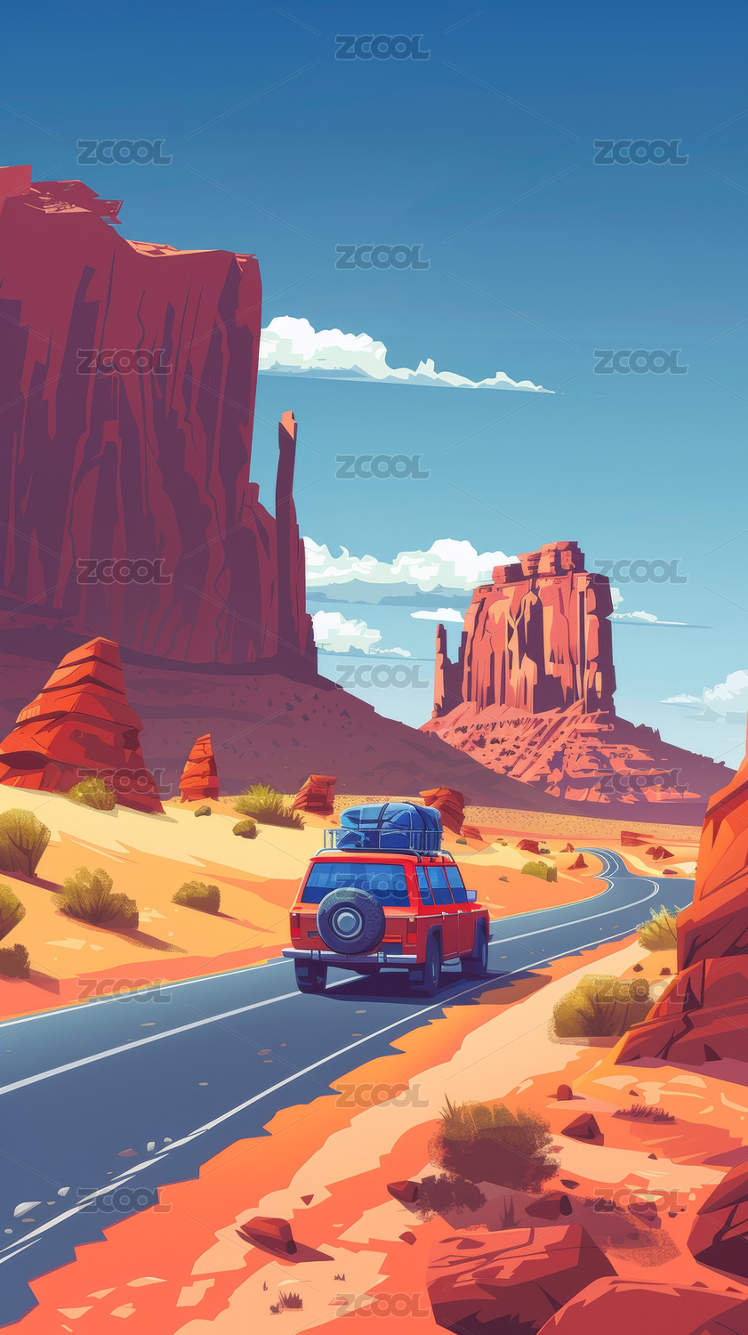 辽阔原野公路上行驶的载着行李箱的汽车插画