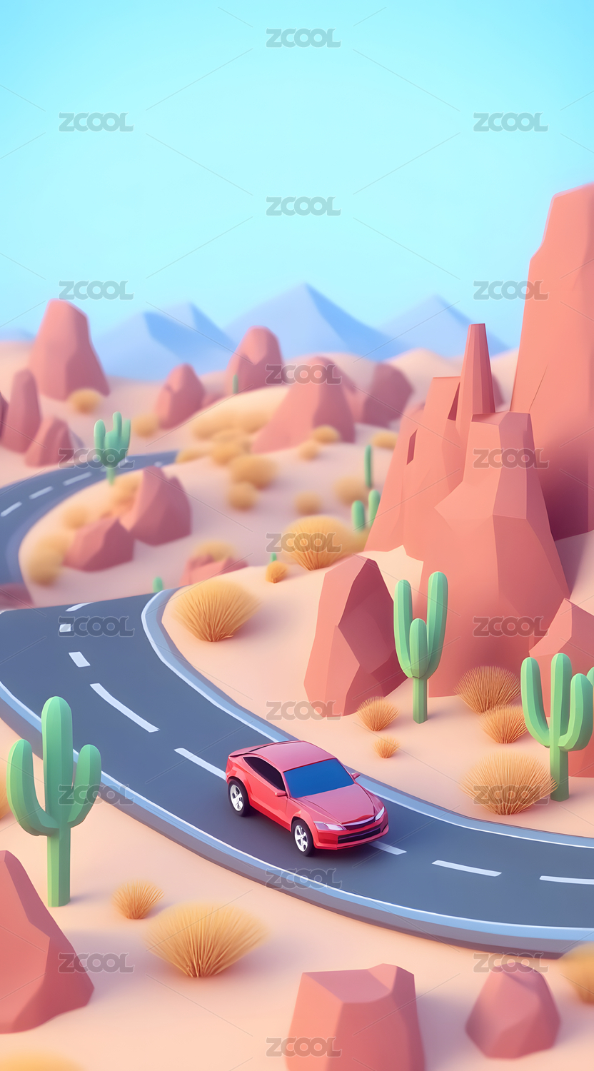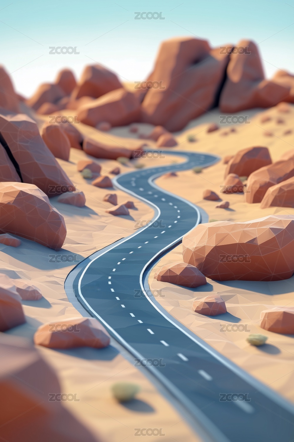 晴朗天气低面多边形沙漠上公路3D立体插画