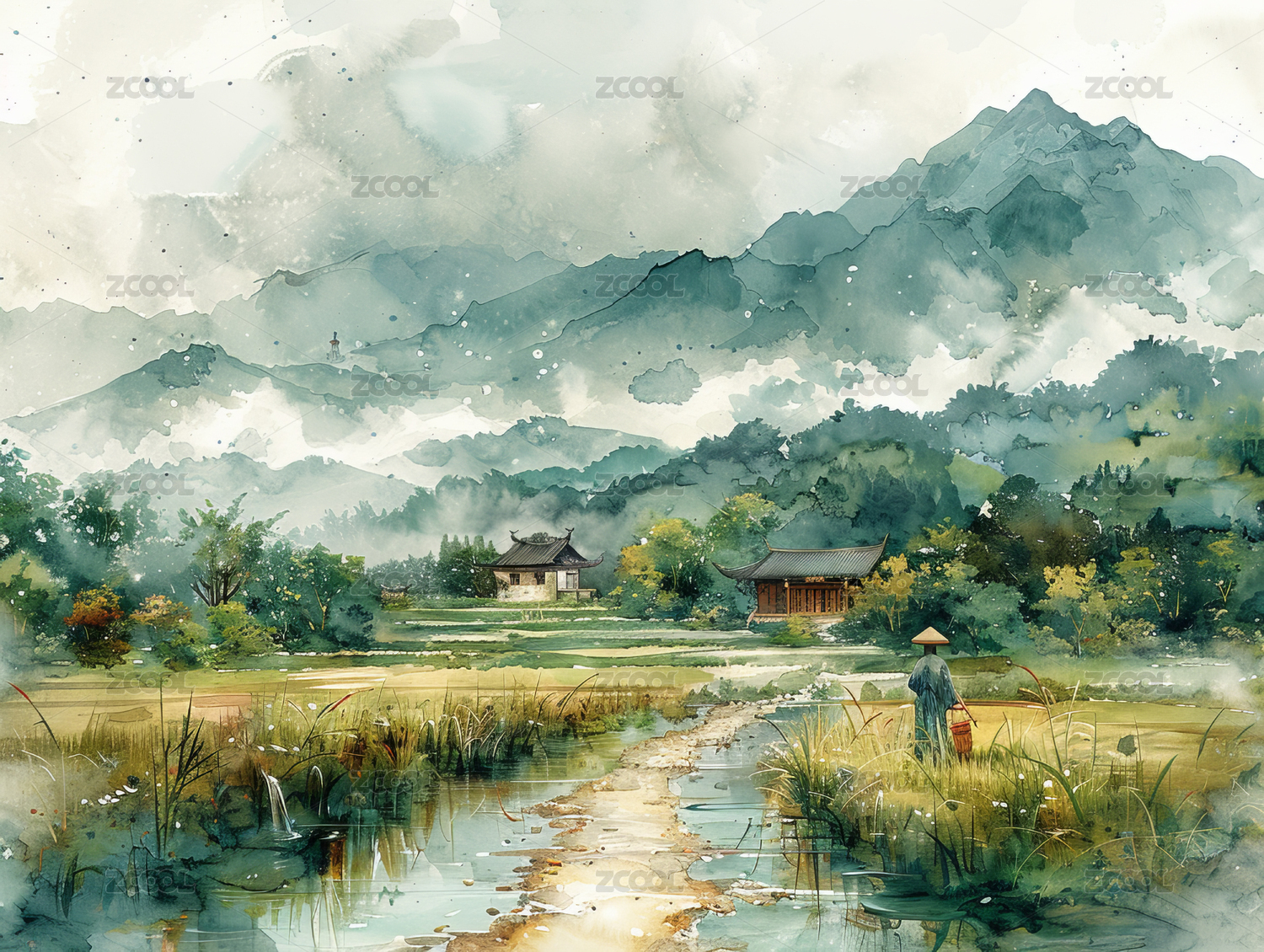 乡村田园风景水彩画