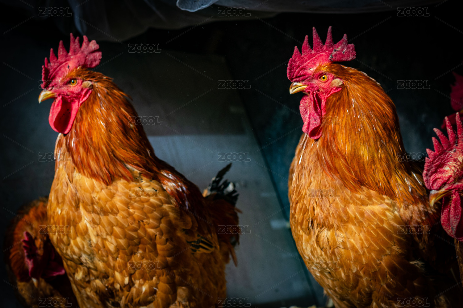 养鸡场里的两只大公鸡特写