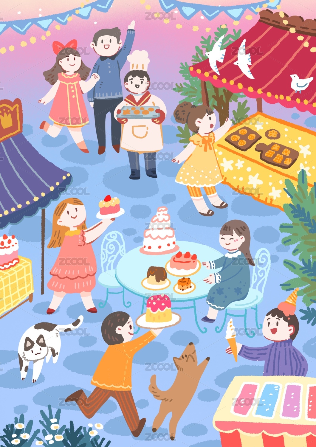 可爱的,插画,动物,花,树,草坪,精灵,女孩,童话,植物