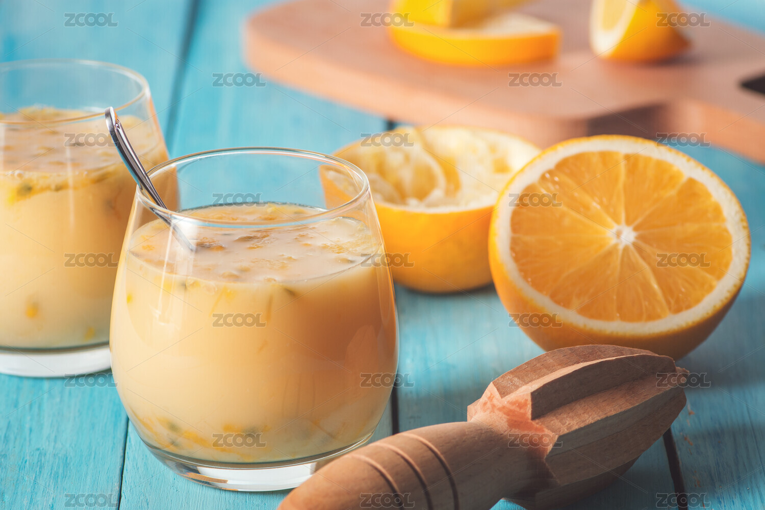 蓝色木板上的两杯子酸奶橙汁百香果果昔
