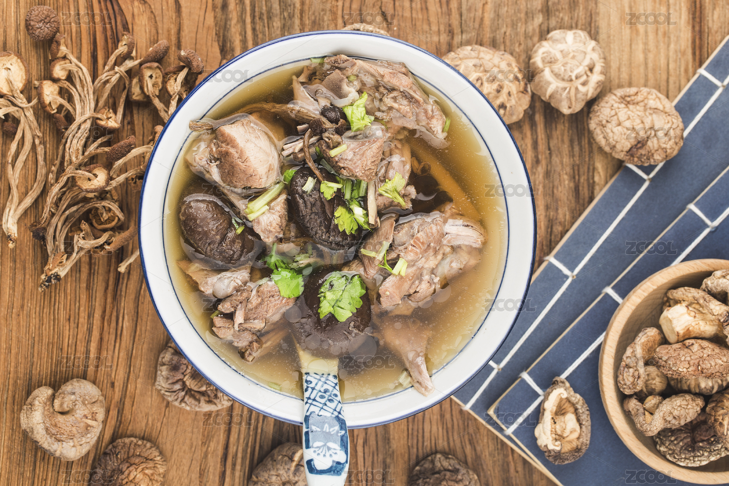 棕色木纹桌面上放着一碗鸡腿海马汤
