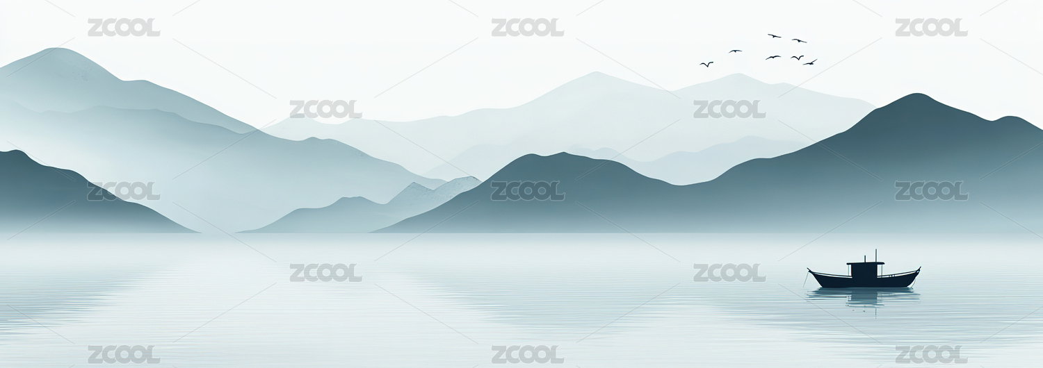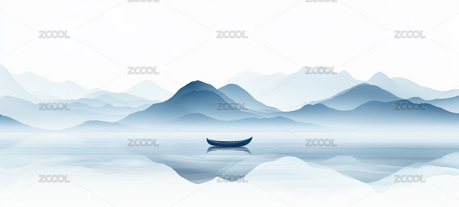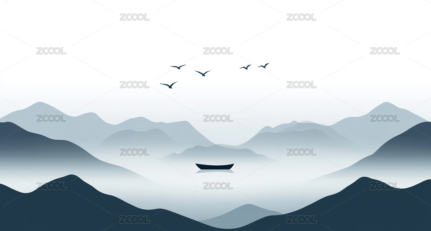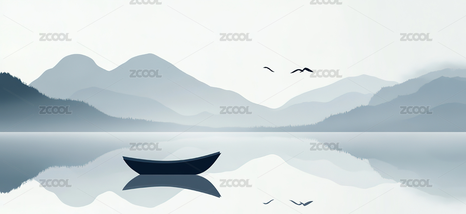 水墨山水意境,扁舟独钓,飞鸟鸣涧