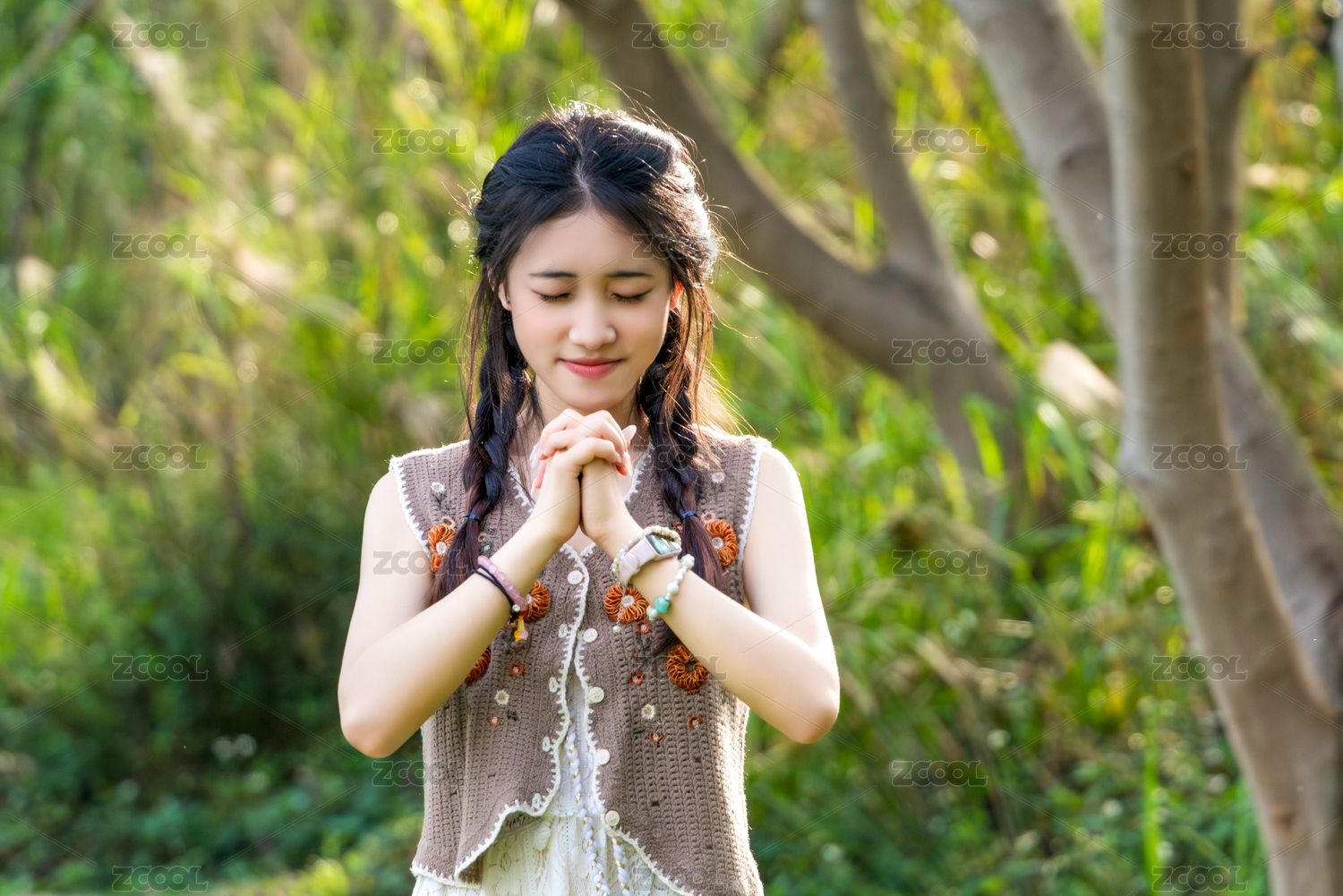 户外公园夕阳下逆光拍摄的亚洲美少女