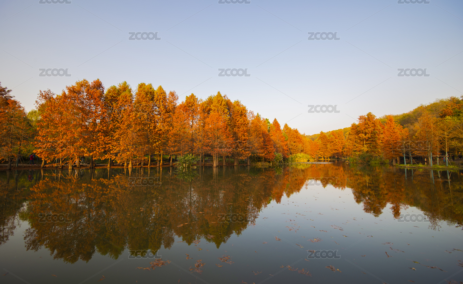 中国上海共青森林公园秋色景观溪流湖泊森林倒影