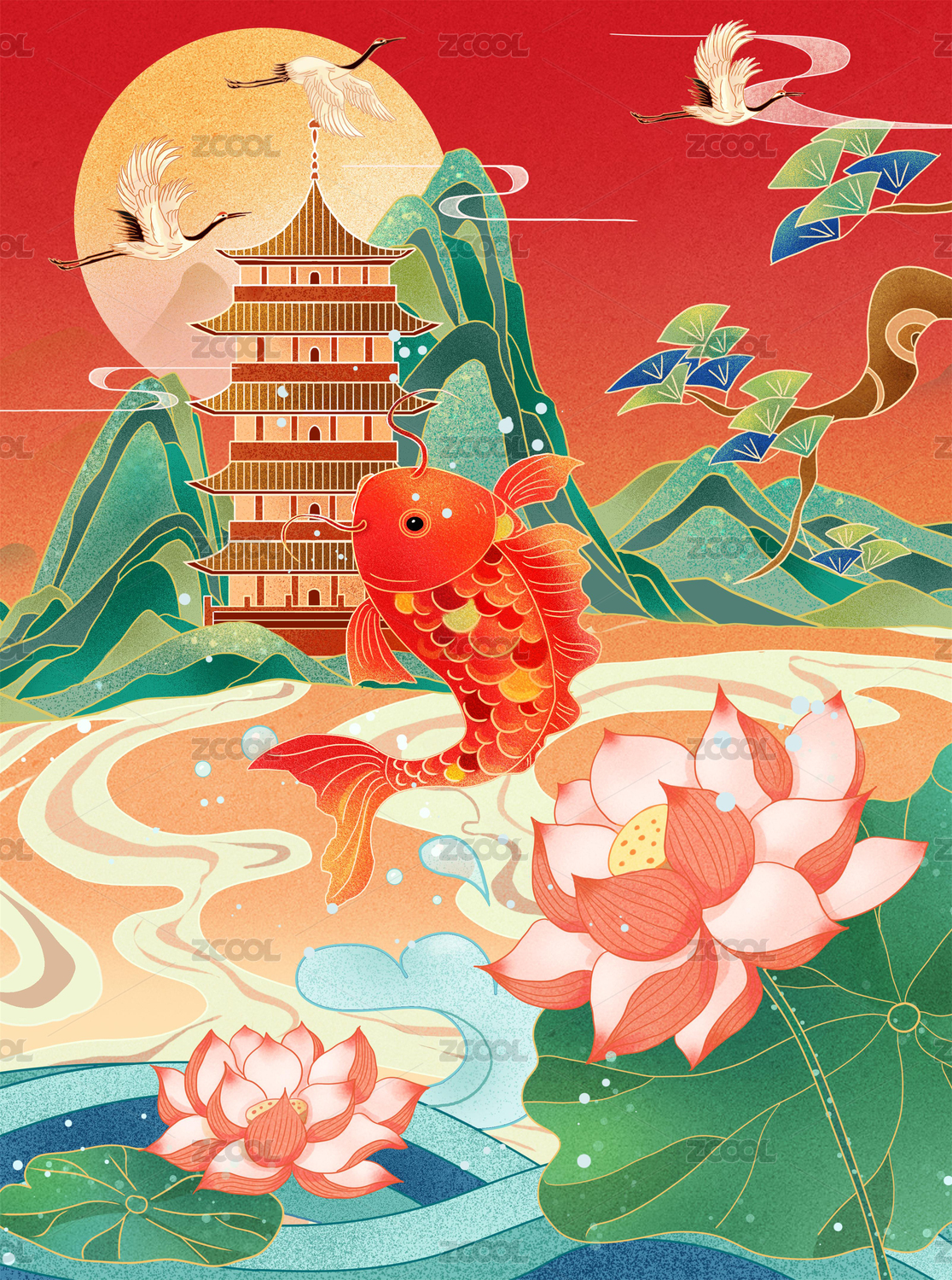 国潮风宝塔锦鲤荷花