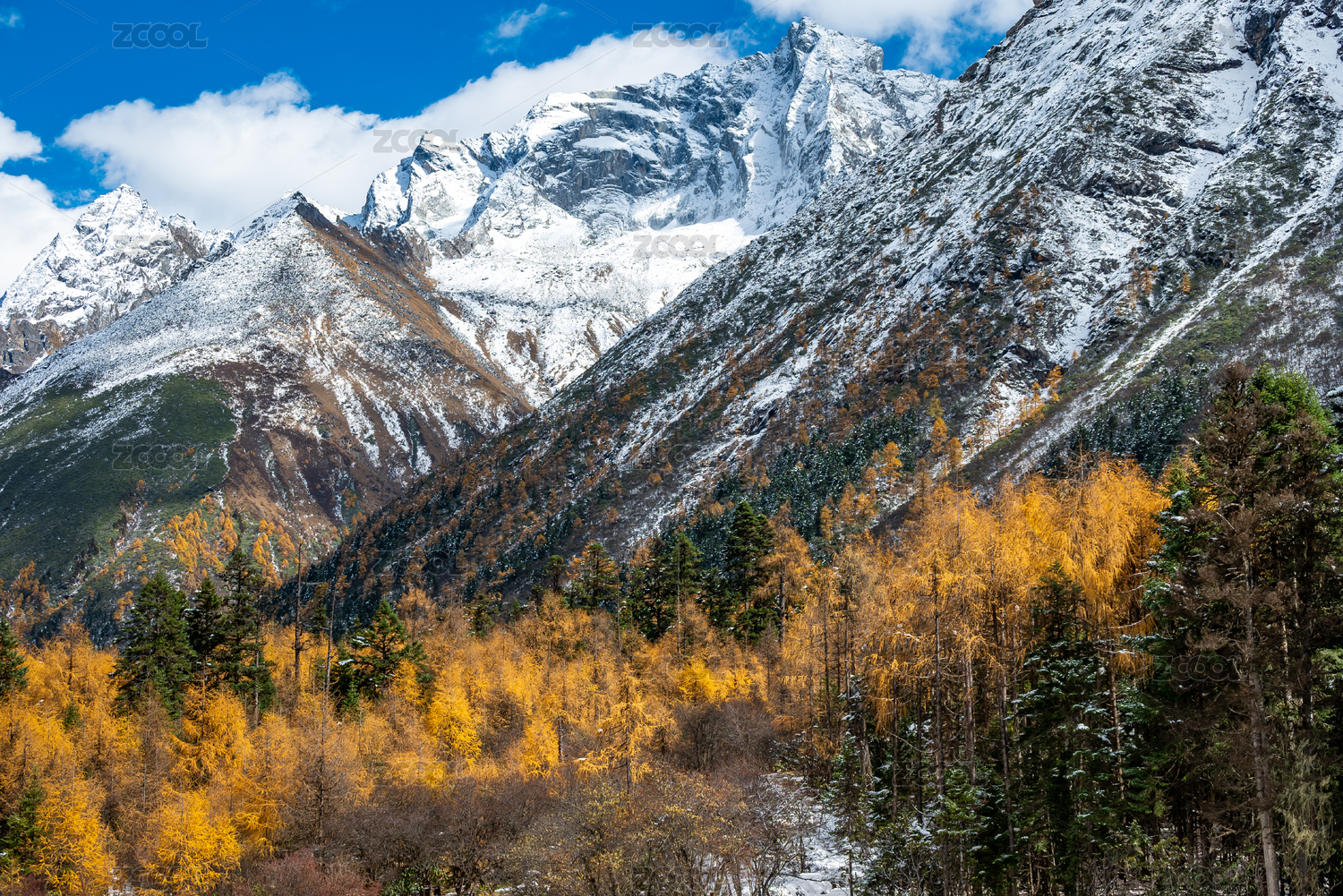 甘孜藏族自治州四姑娘山双桥沟秋季雪山彩林风景