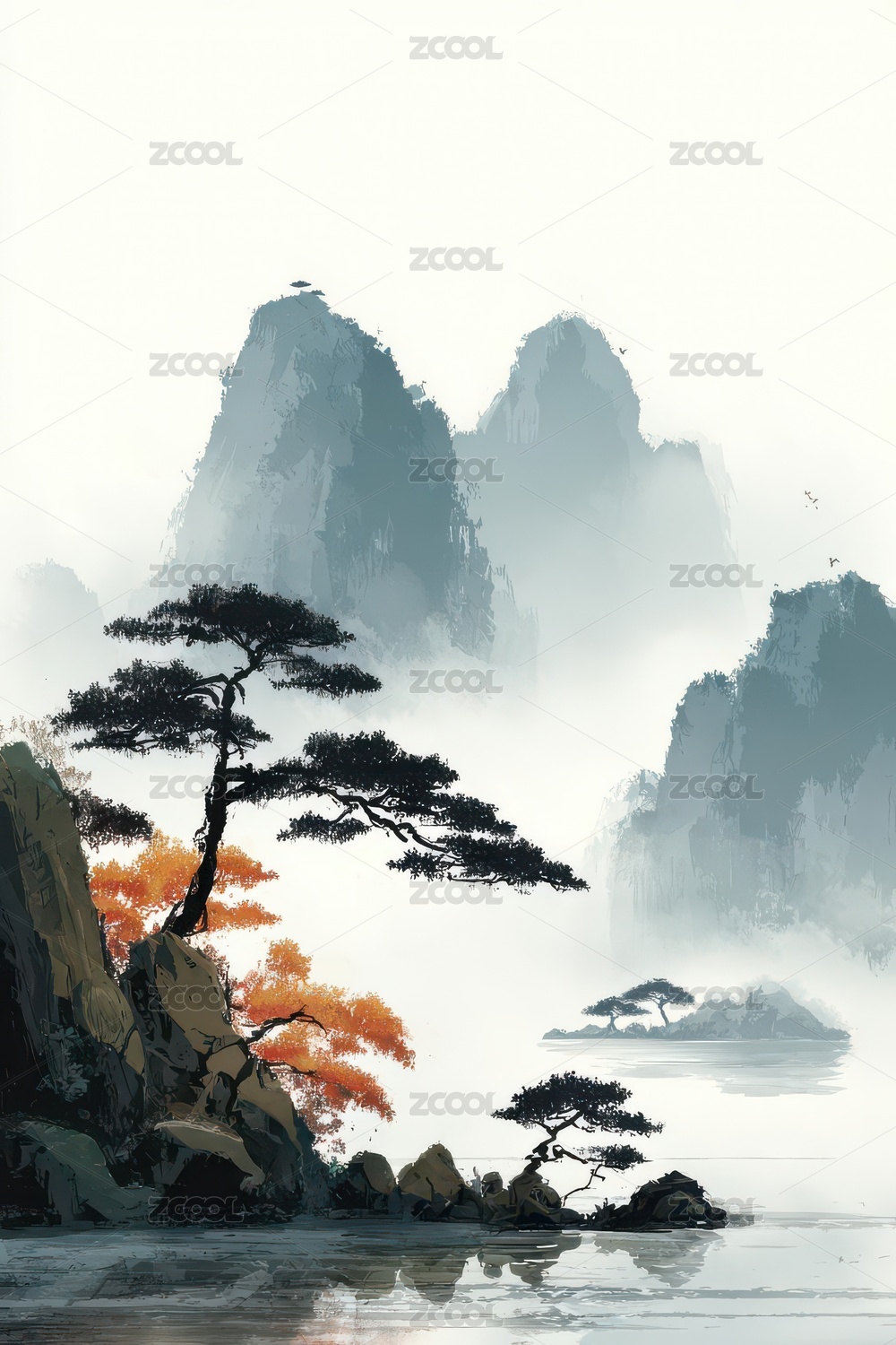 山水云雾间松树傲立的东方意境画