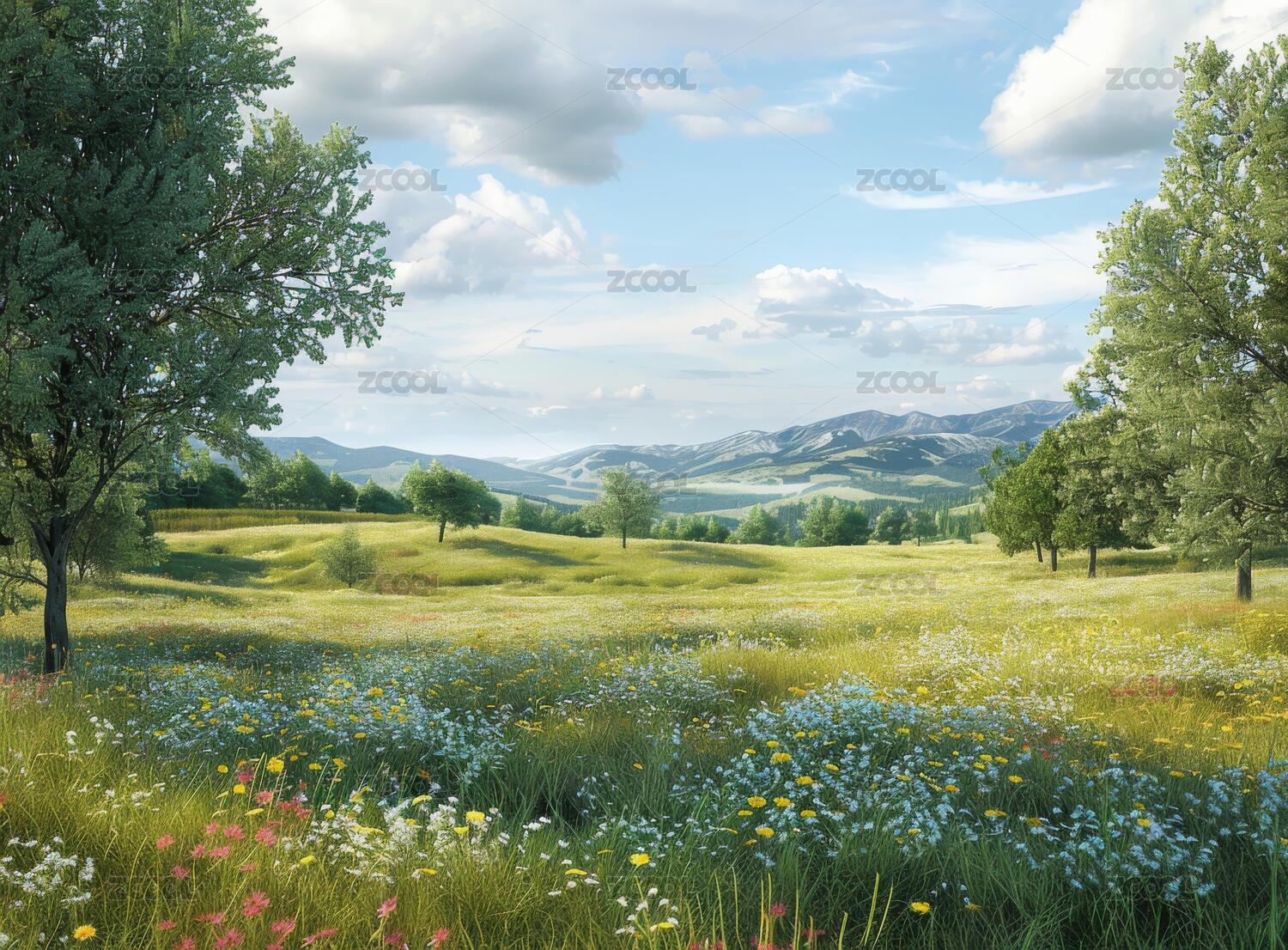在蓝天下绿树成荫鲜花盛开连绵起伏的山丘