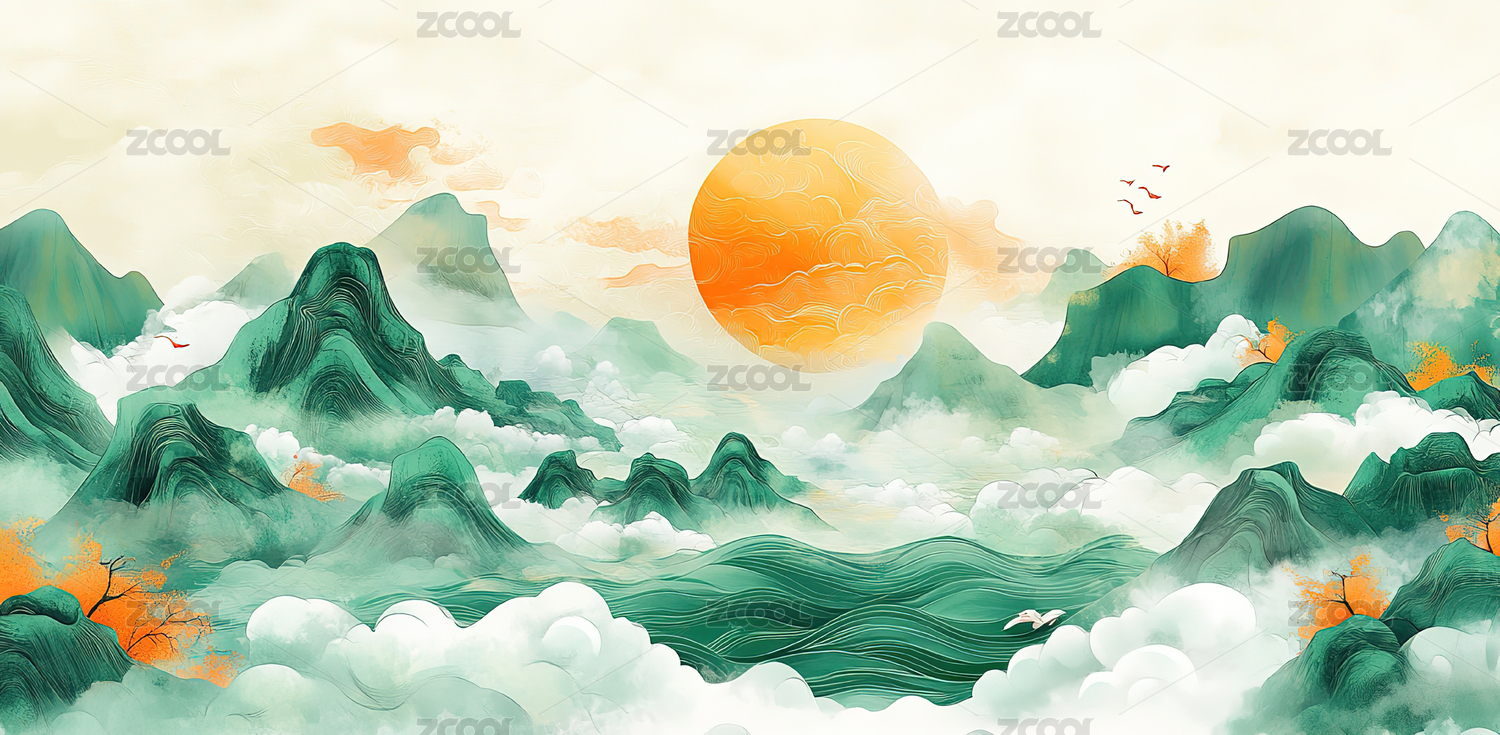 传统红太阳山水插画海报背景装饰画