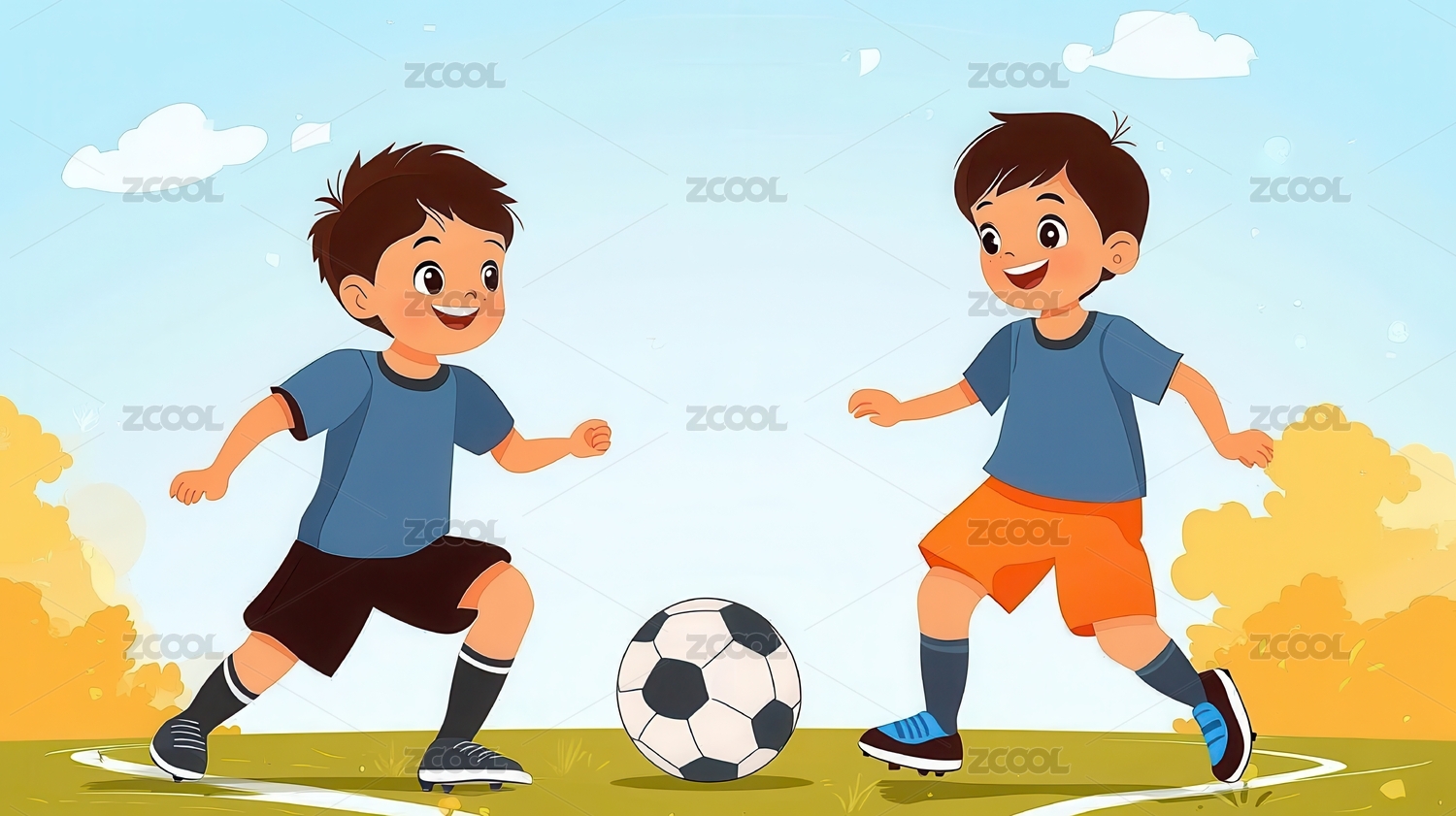两个小男孩欢笑着踢足球的场景