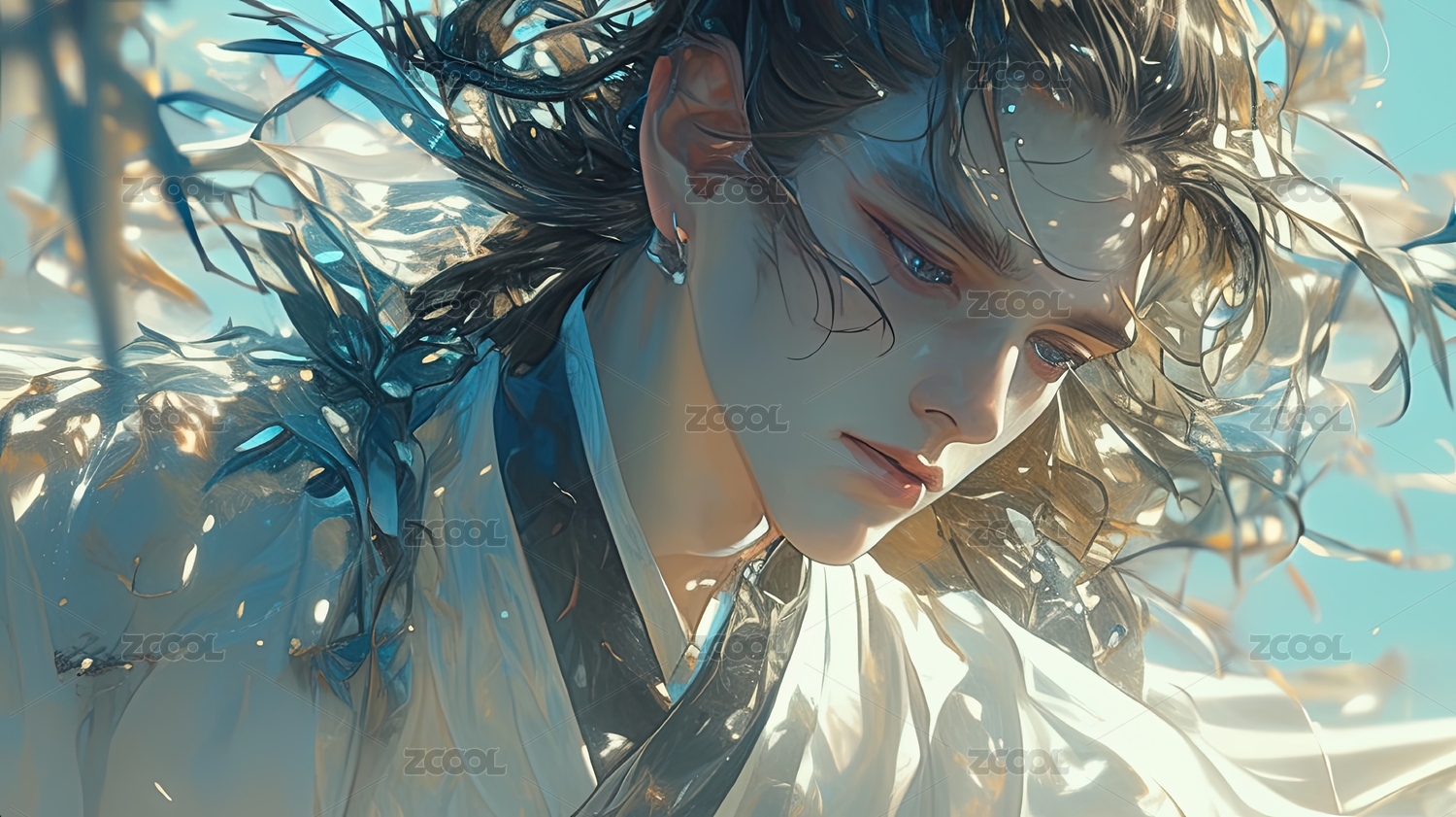 概念设计,传统服饰,奇幻艺术,角色设计,文化象征,年轻男子,深蓝和服,银色眼睛,幻想背景,黑暗奇幻