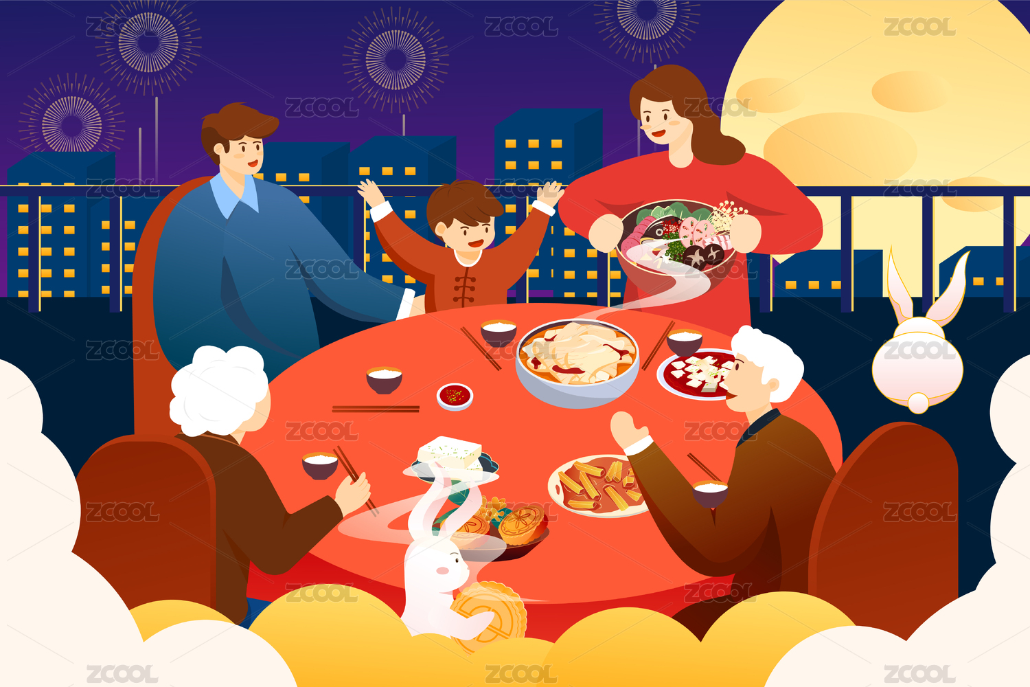 中秋节一家人团圆聚餐吃饭庆祝节日活动插画