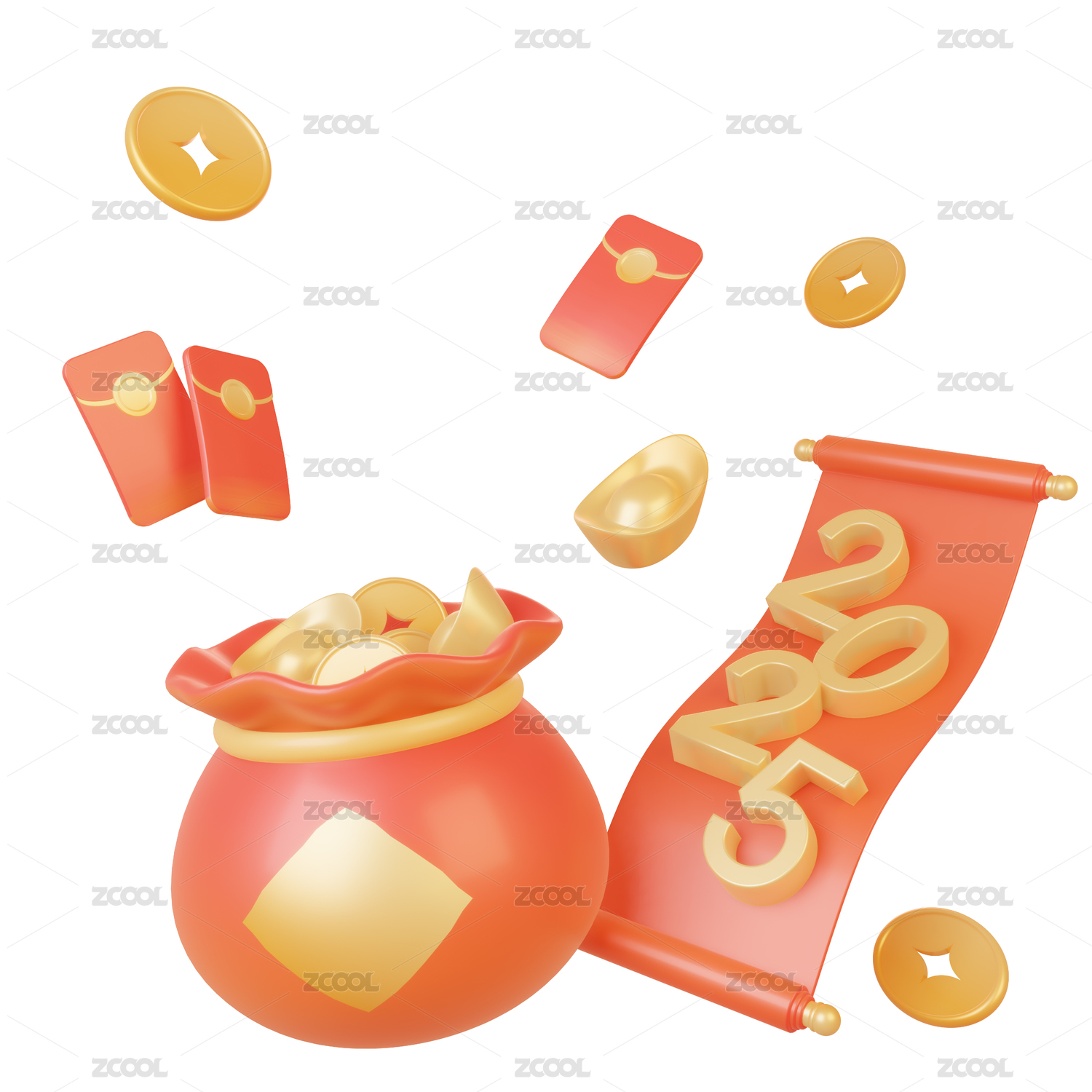 红金色钱袋金算盘新年喜庆3d立体插画元素