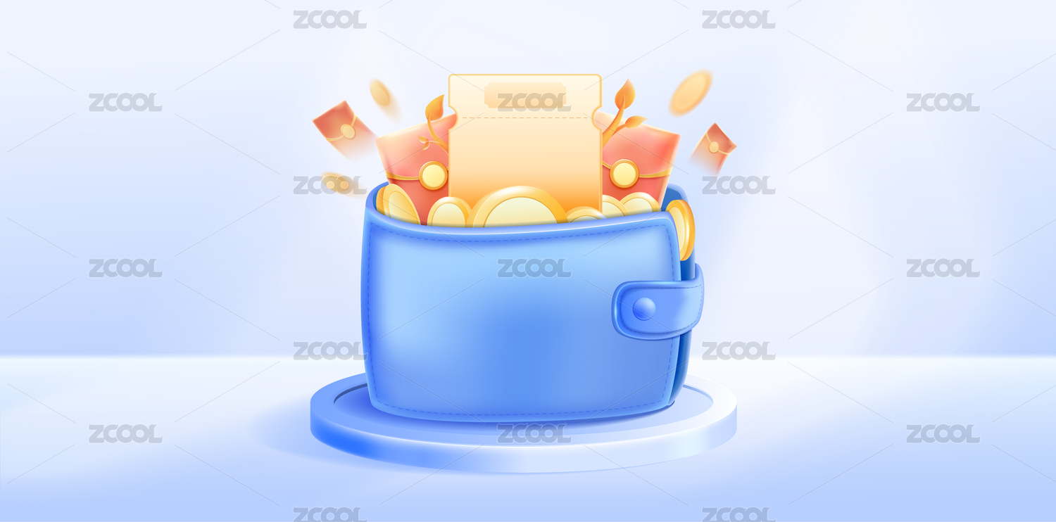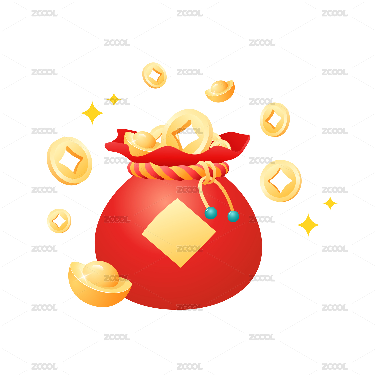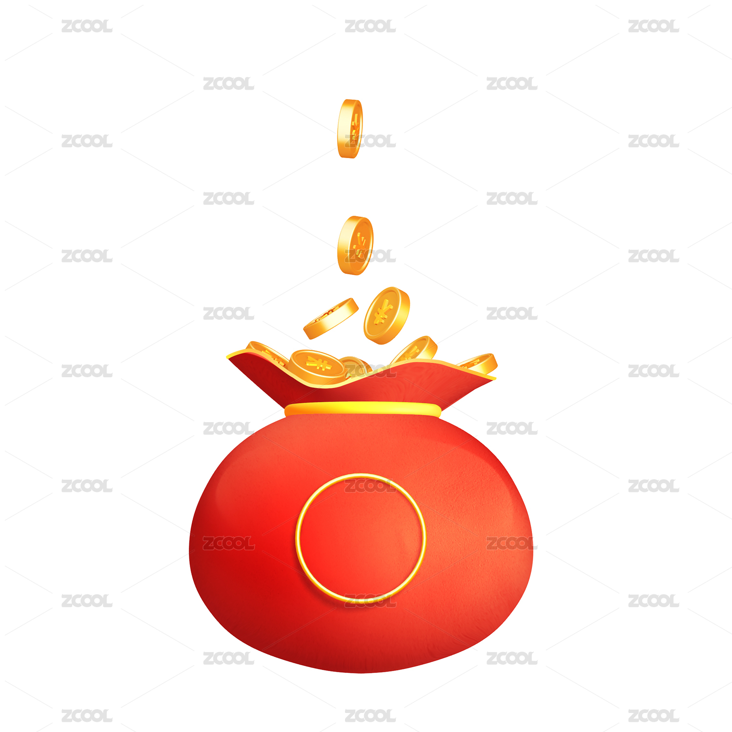 红金色装满元宝硬币的钱袋新年喜庆3d插画