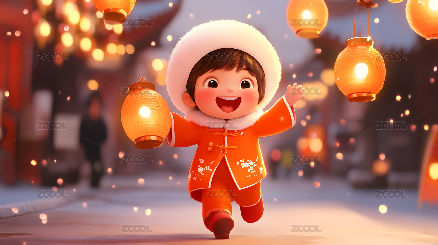 3D挂满灯笼欢度春节的的卡通可爱男孩