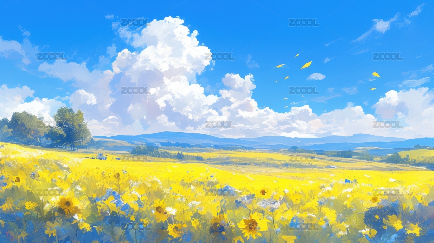 花海, 黄色, 蓝天, 白云, 自然, 风景, 宁静, 美丽, 春天