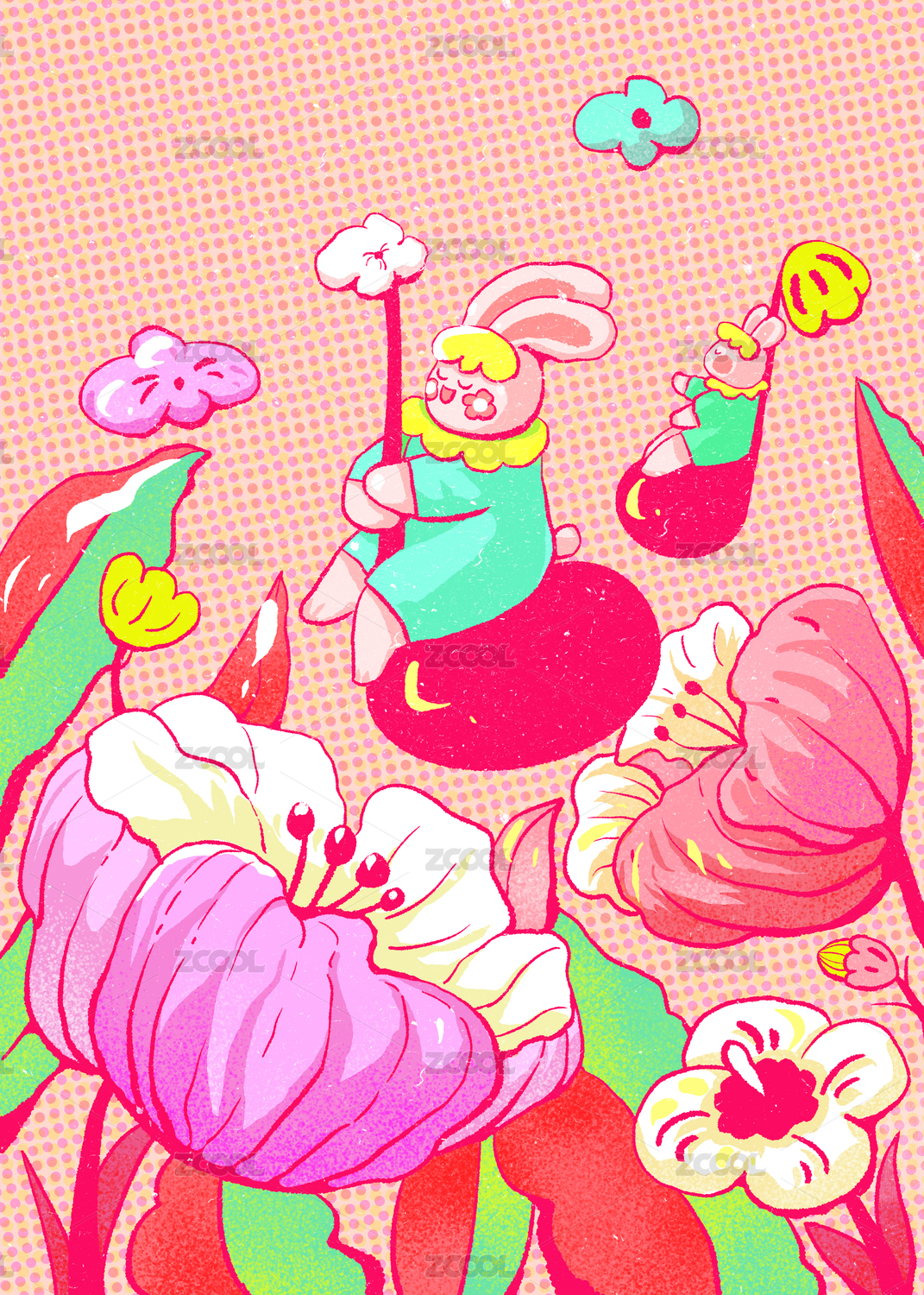 花朵丛兔子骑着音符音乐插画