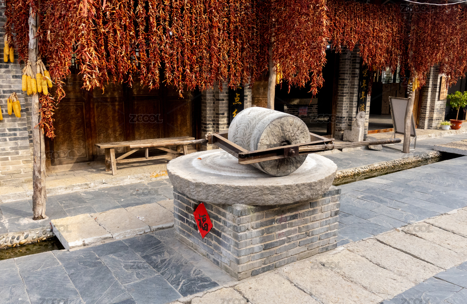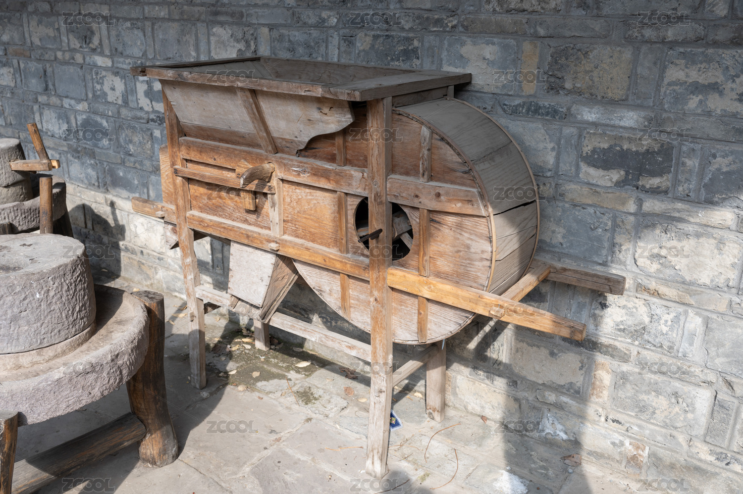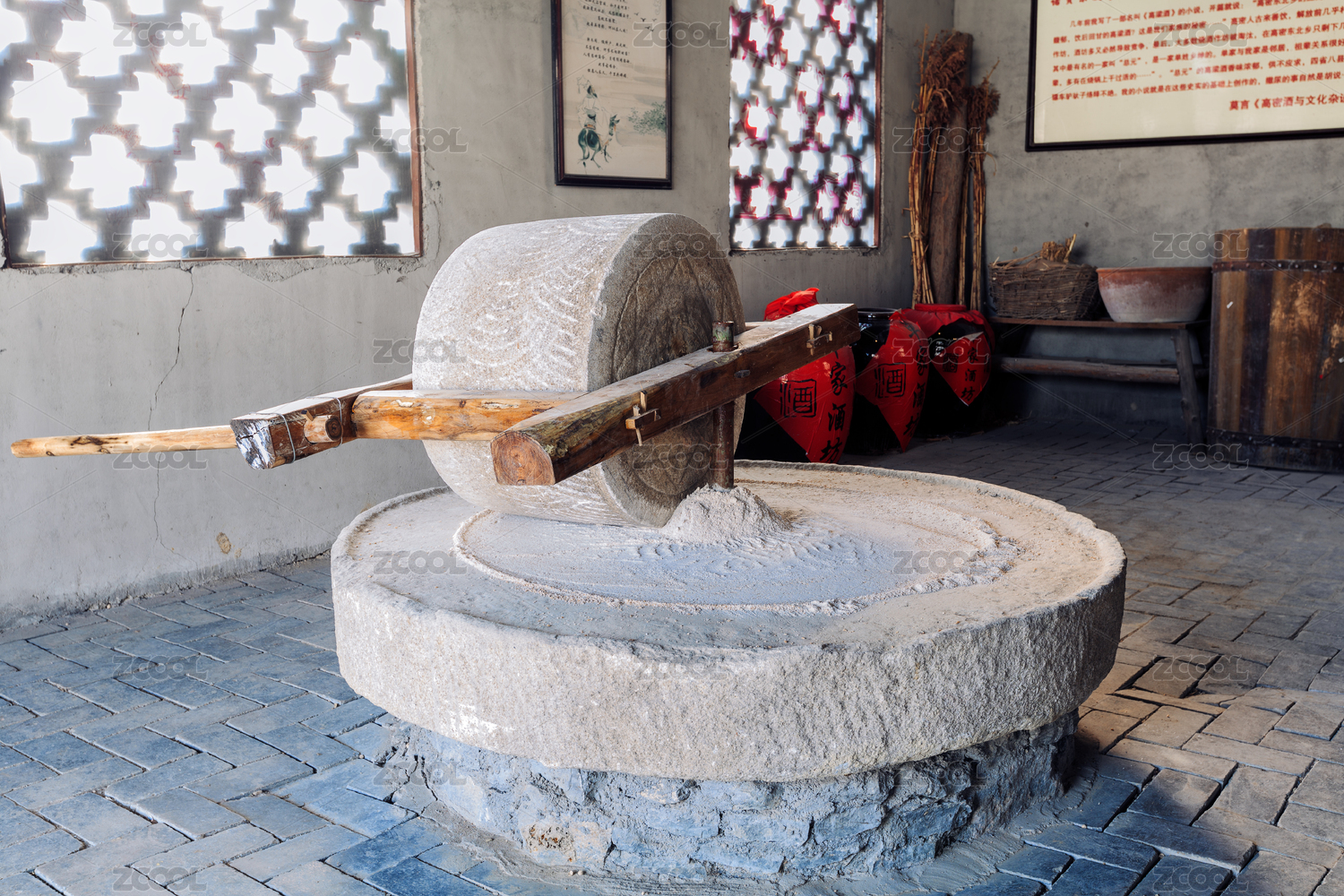 中国山东省临沂市沂蒙红色影视基地内沂蒙山村的石碾子