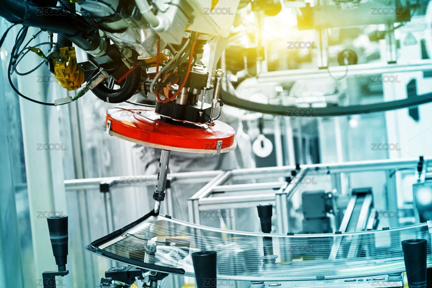 工厂流水线上的自动化机械臂正在涂胶汽车玻