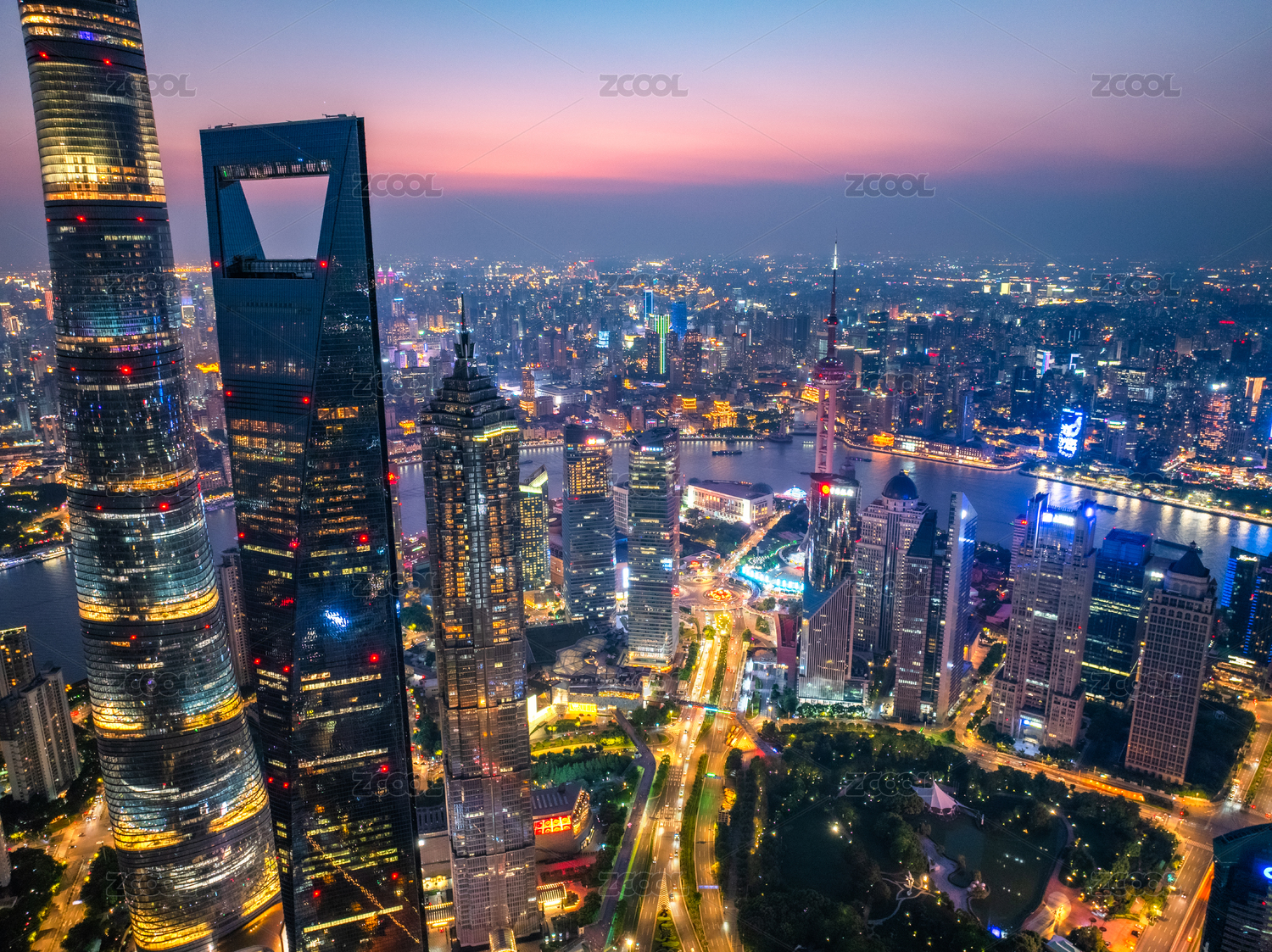 中国上海市浦东新区陆家嘴夜晚航拍风光