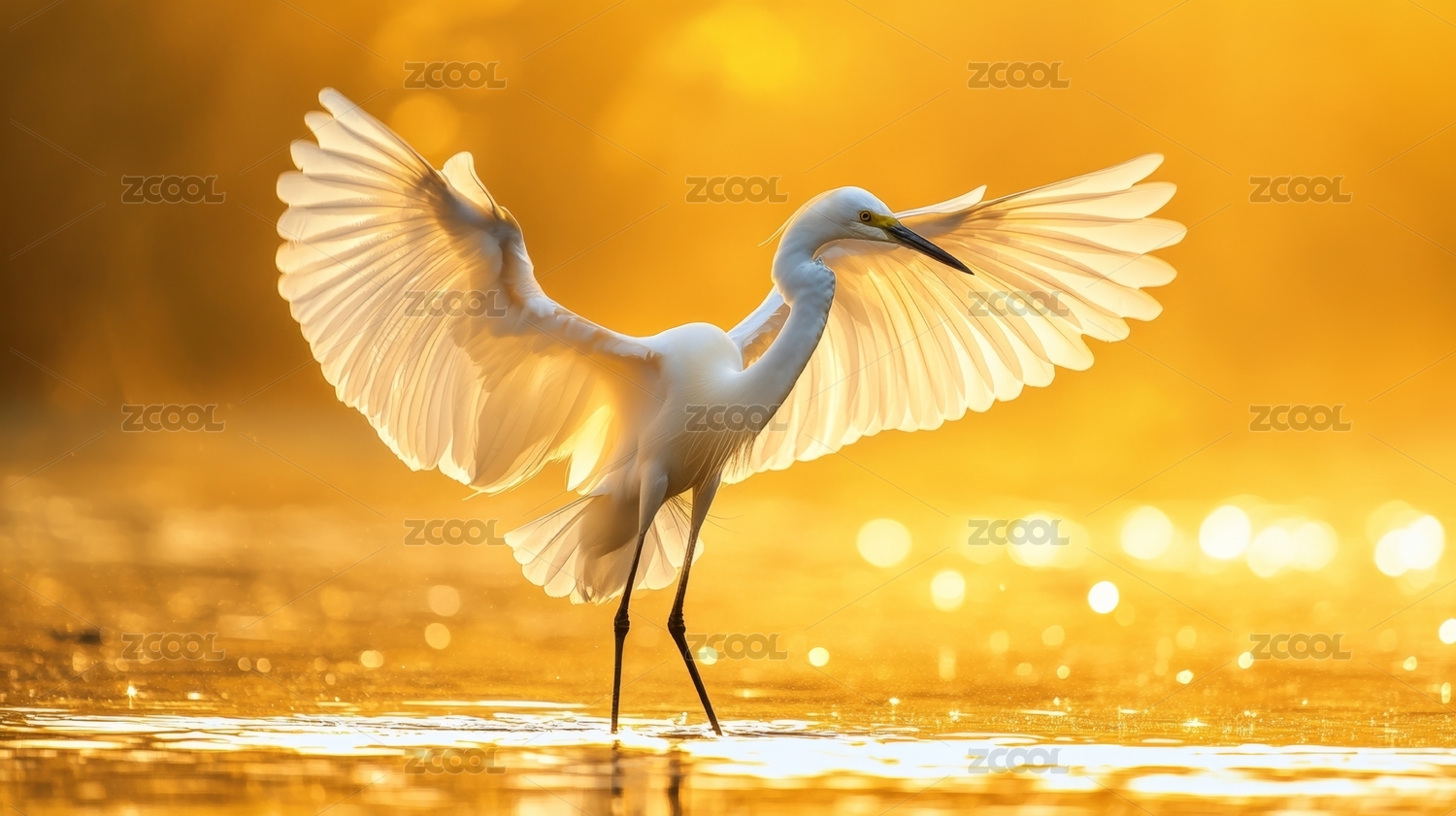 白鹭展翅金色水面