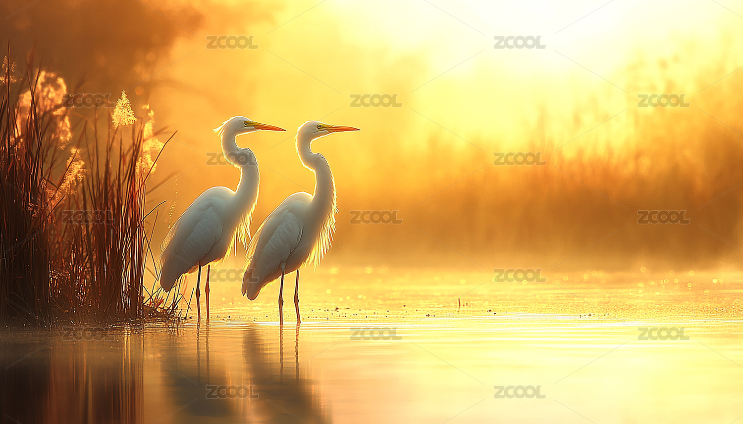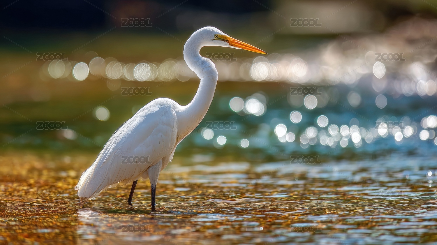 优雅白鹭金色晨曦中的宁静