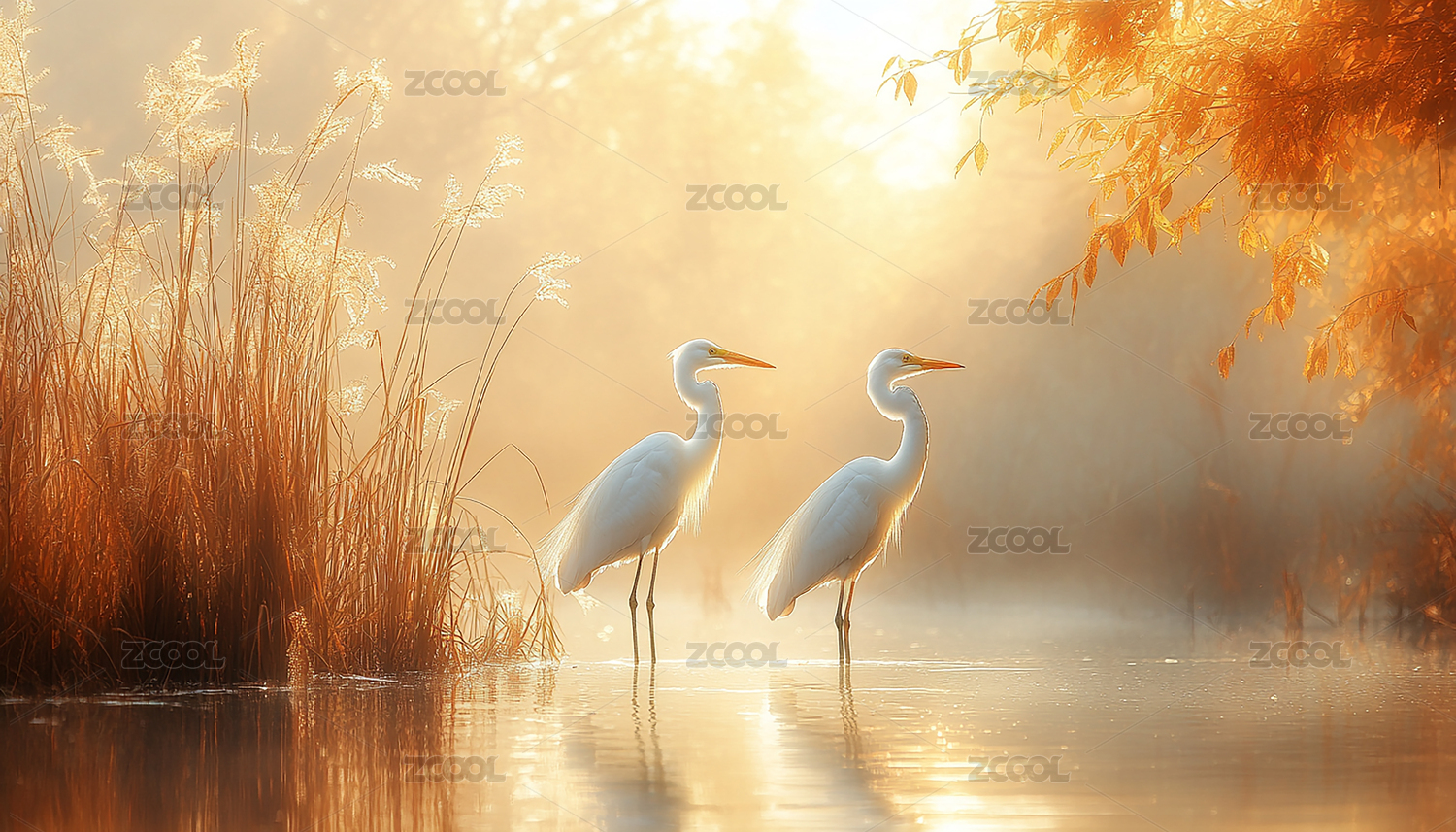 优雅白鹭静谧水塘秋日景色