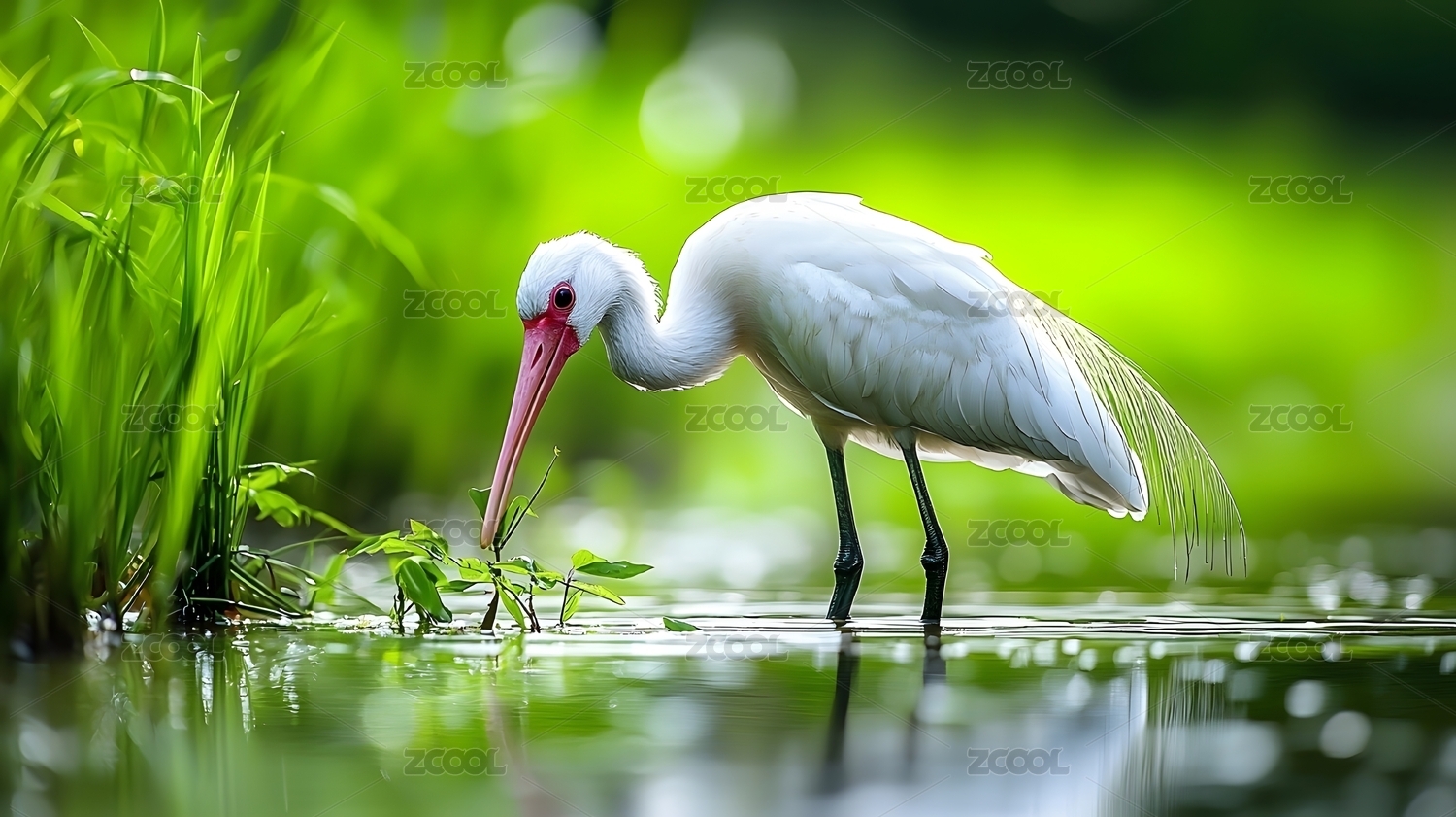 夏日湿地中优雅觅食的白鹭