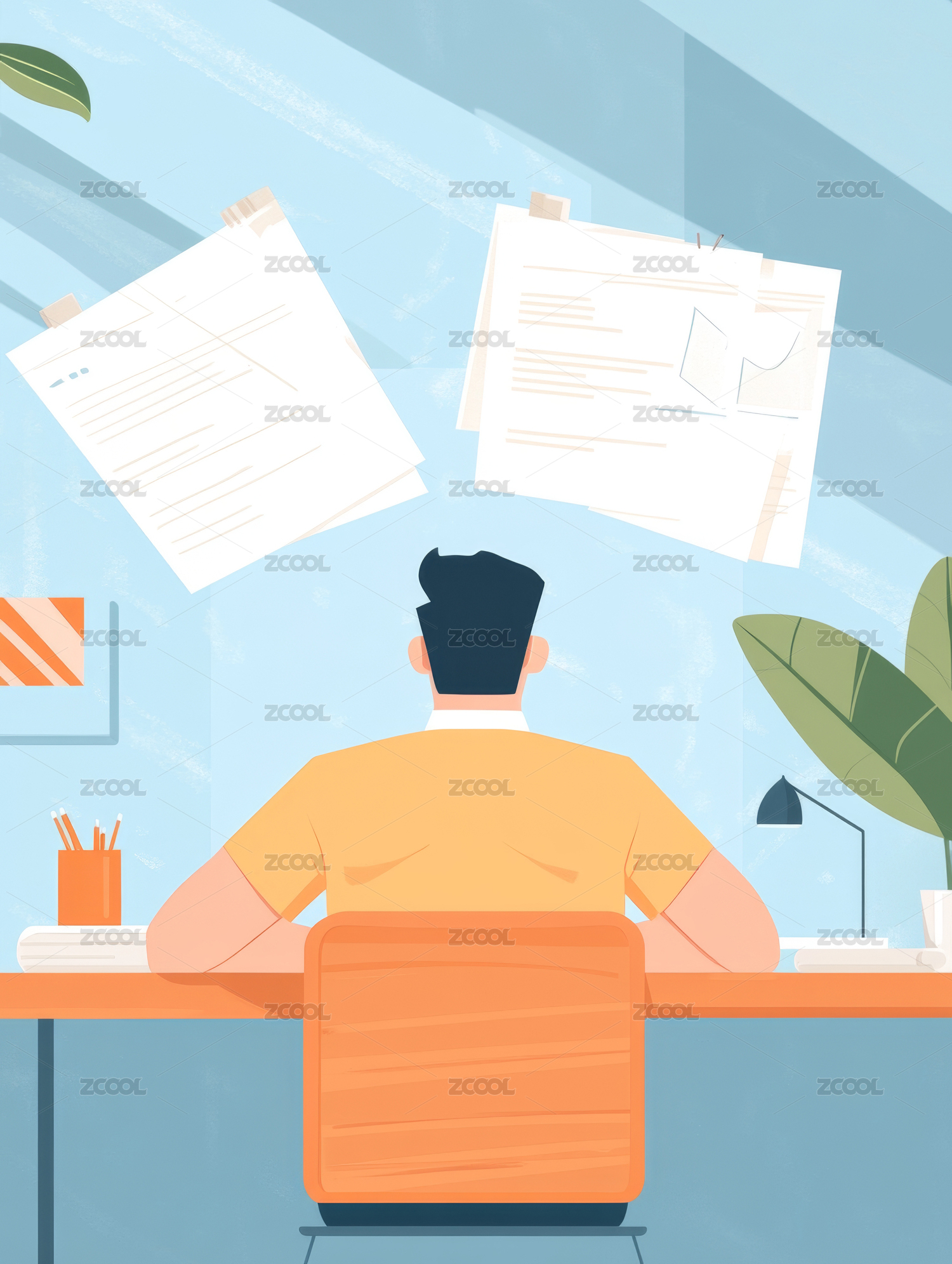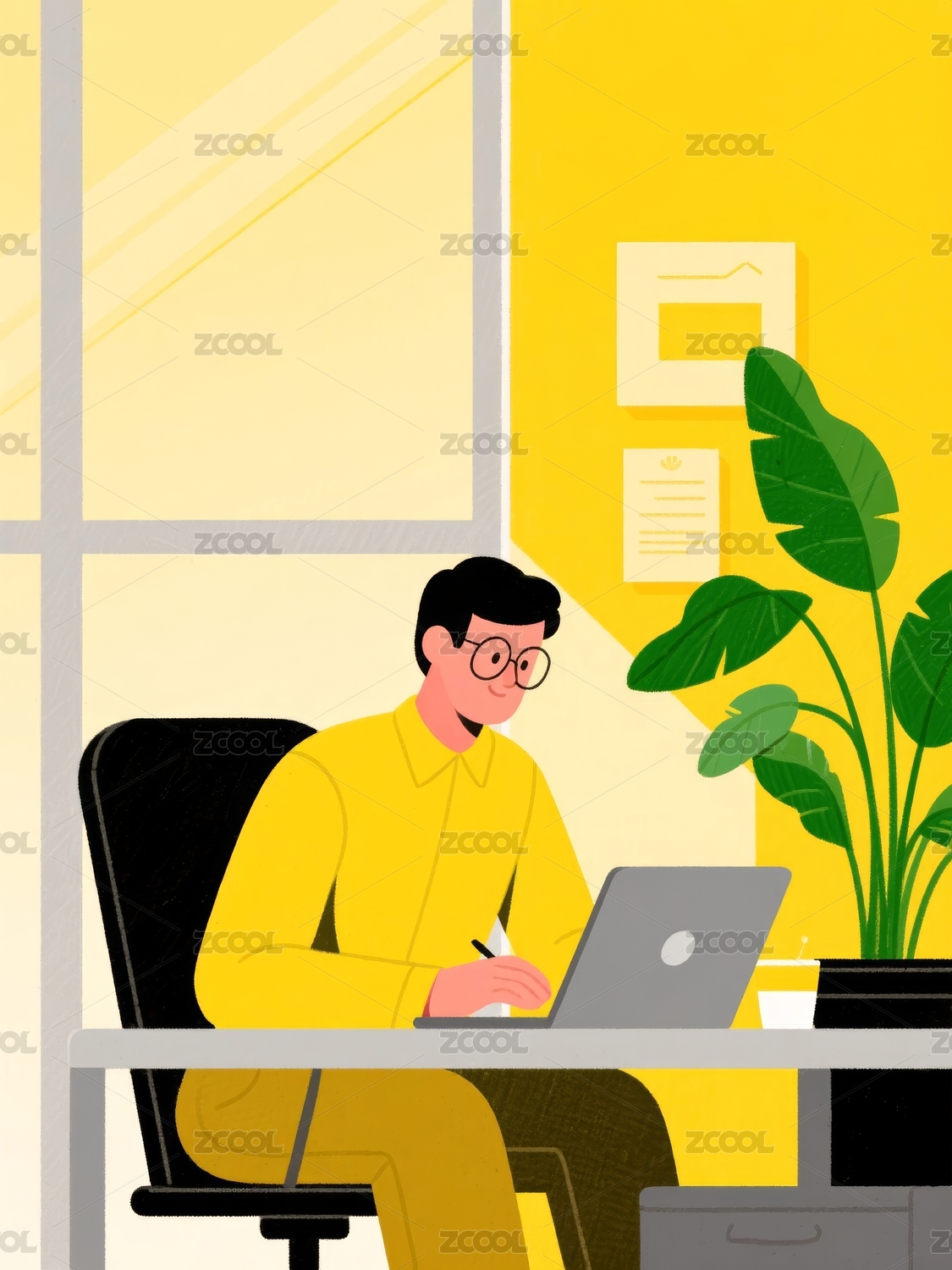 青年,打工人,加班,电脑,笔记本,蓝色,简洁,扁平,元素,书桌