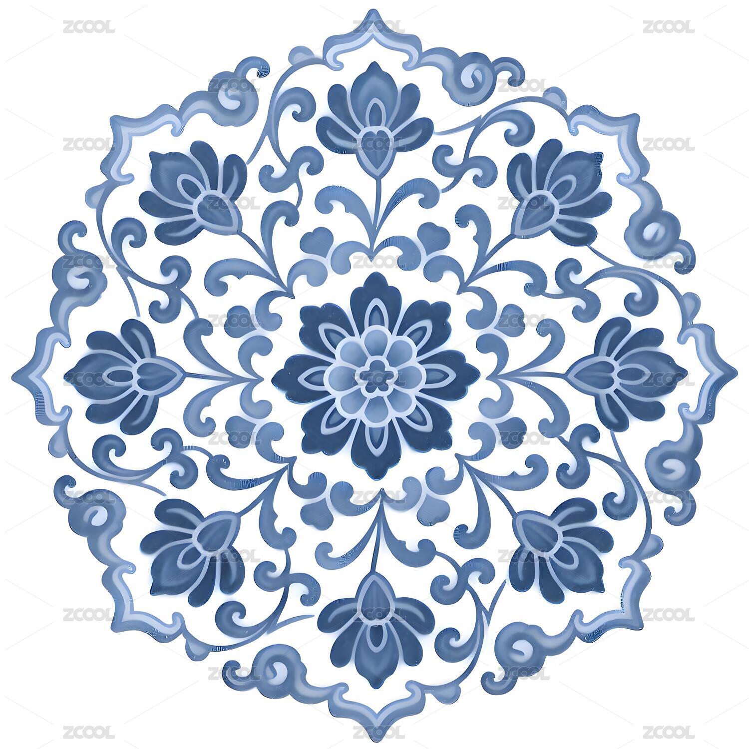 中国传统的蓝色青花图案纹样,白背景