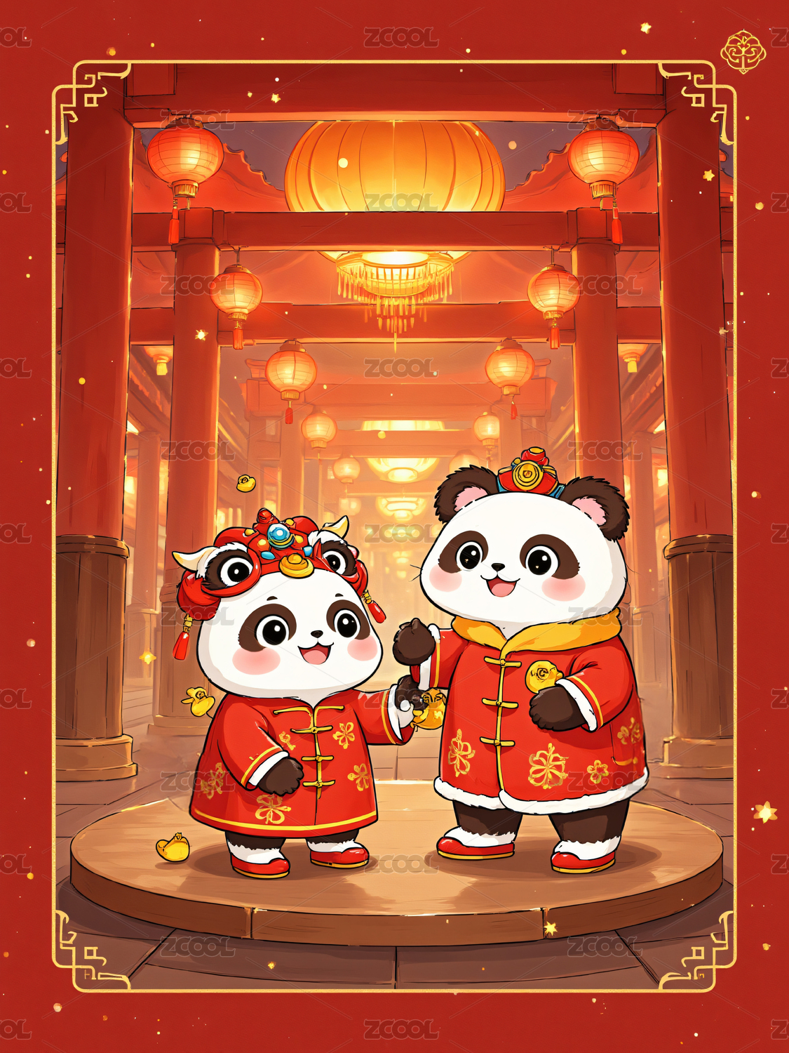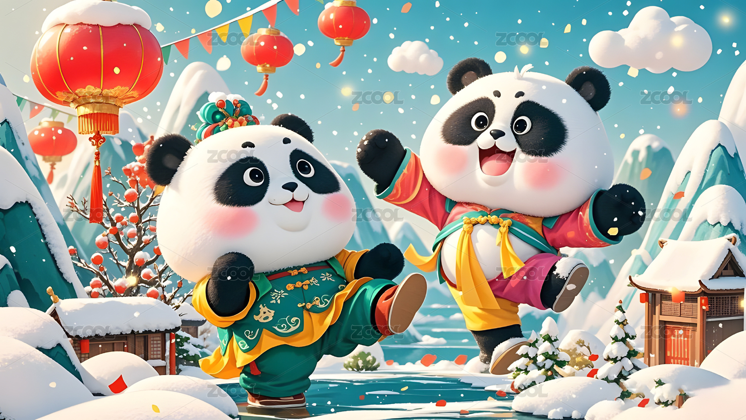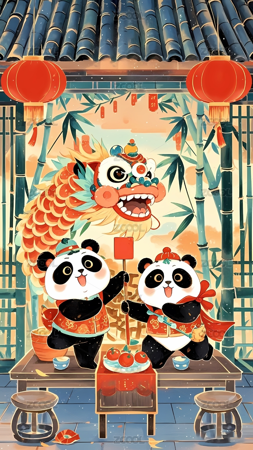 熊猫,国宝,中国风,新年,春节,团圆,年夜饭,美食,卡通,可爱