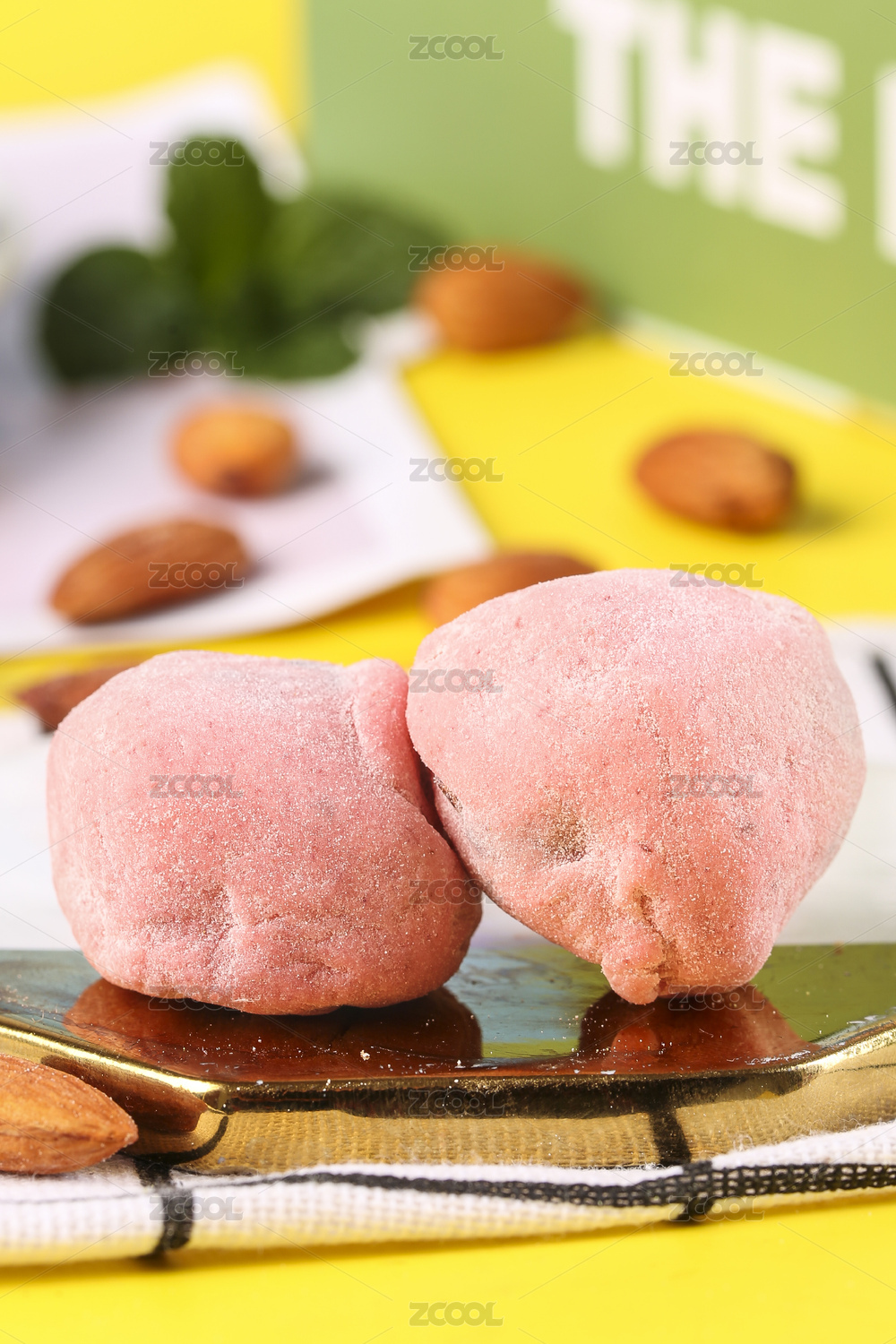石垫上放着一小堆草莓味奶枣的一颗掰开奶枣