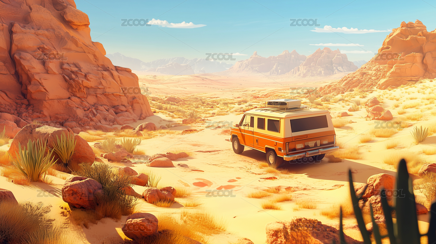 行驶的汽车沙漠荒漠巨石仙人掌蓝天白云