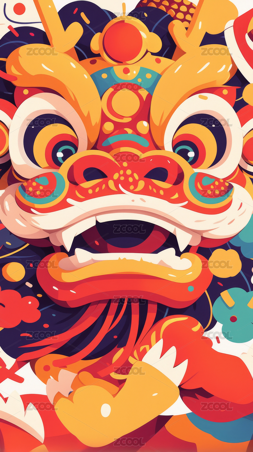 扁平化新年国潮风格醒狮喜庆氛围插画