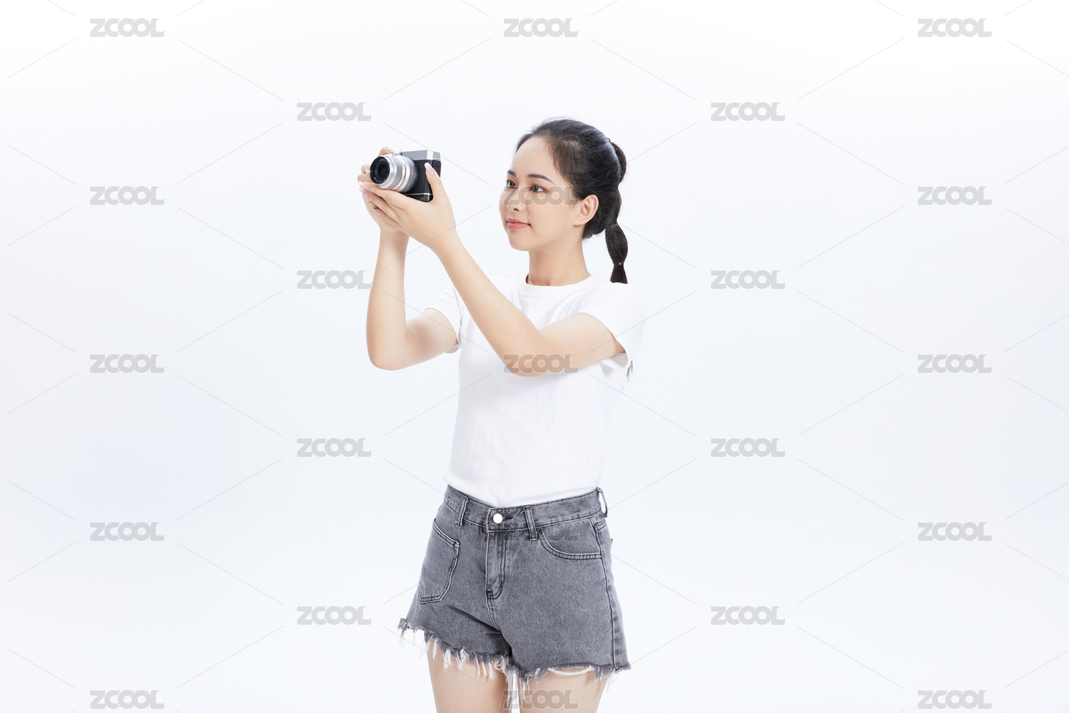 女性,大学生,白底,摄影师,拍照,笑容,摄影爱好者,相机,拿着,拿着相机