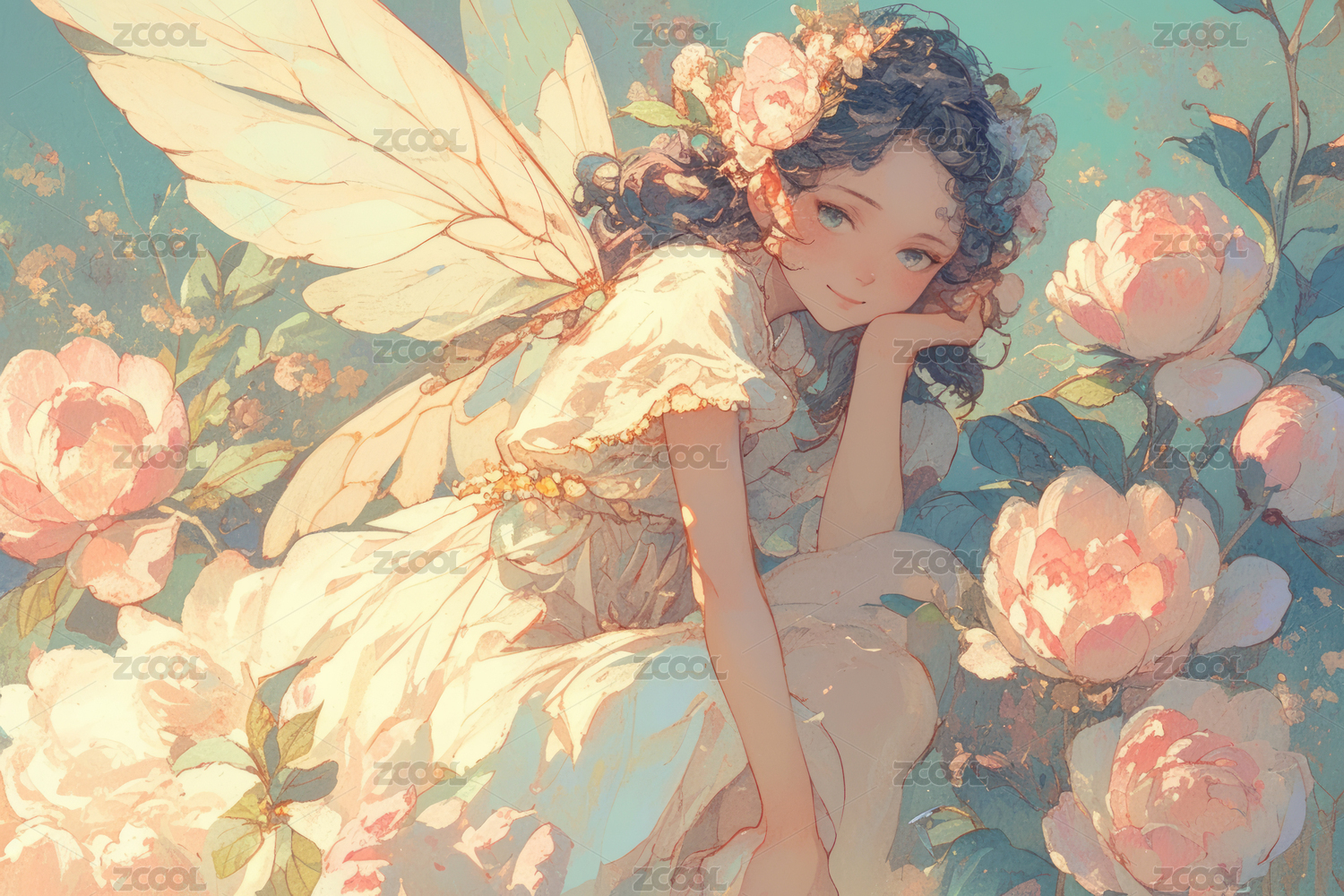 坐在巨大花瓣上的仙女
