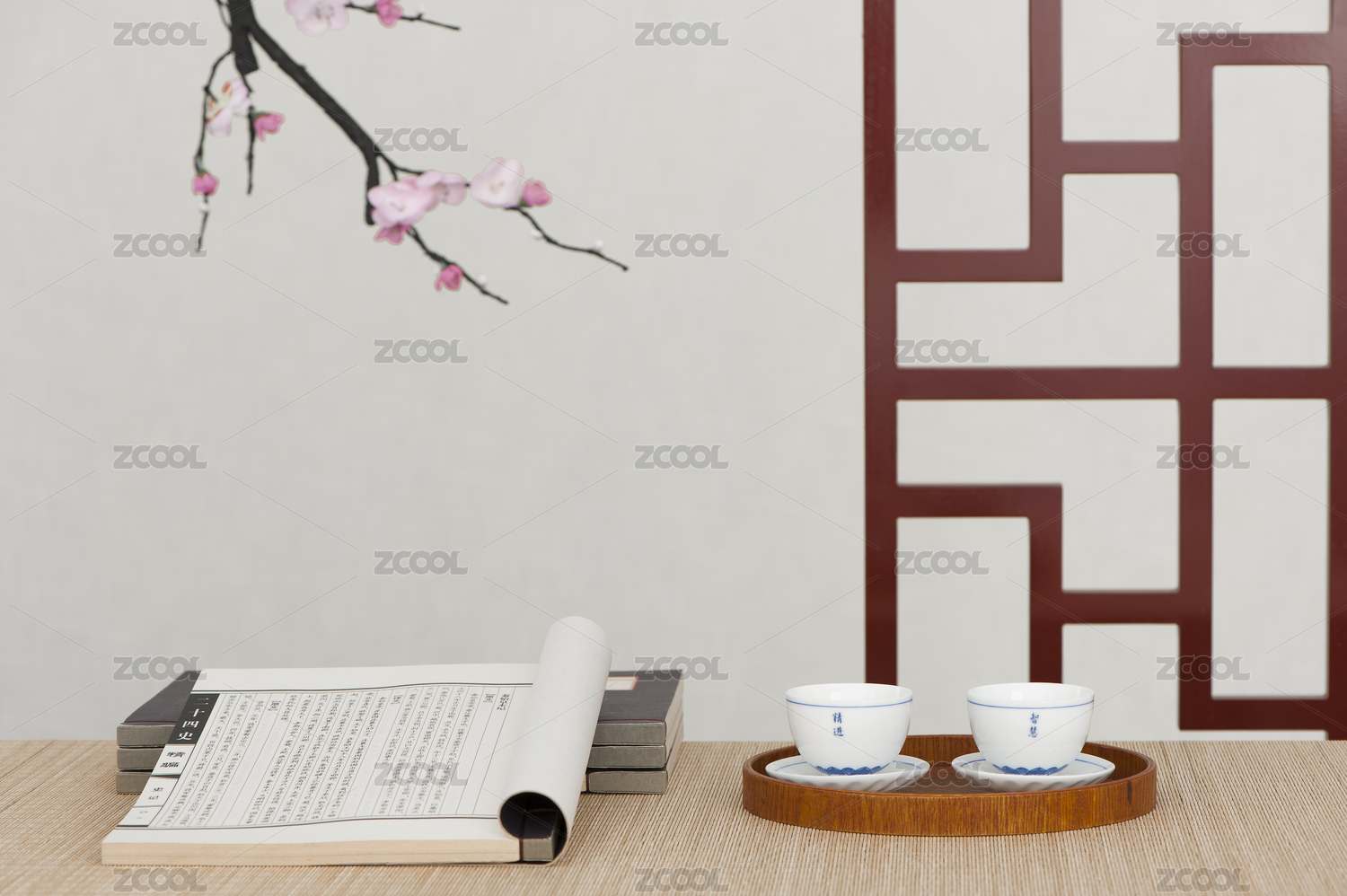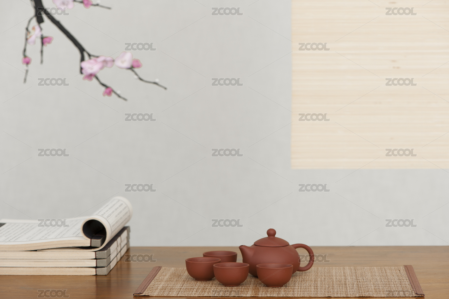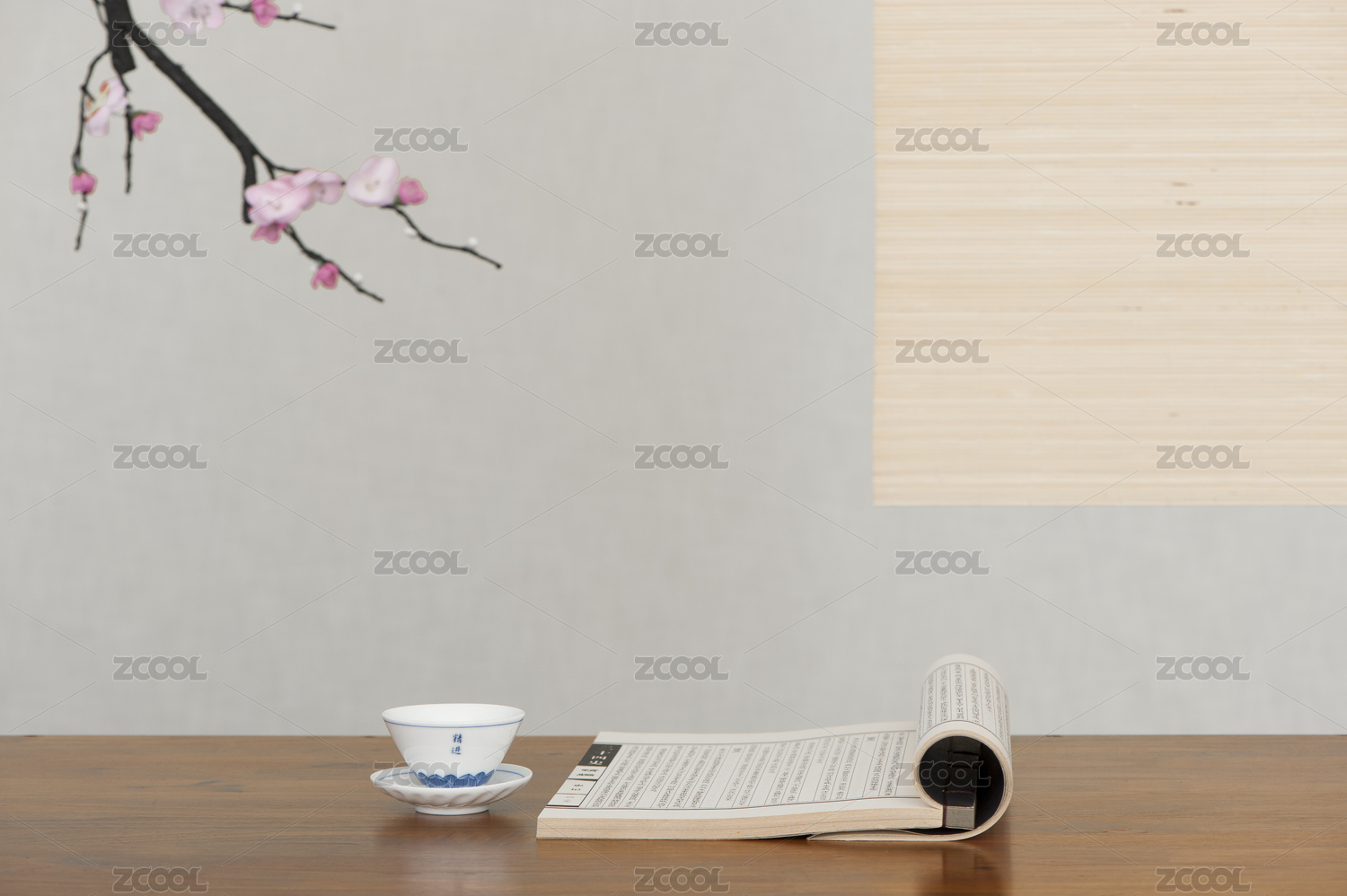 中国画风格,茶帘下面的桌面上放着茶杯茶壶和一摞线装书,边上是一枝梅花